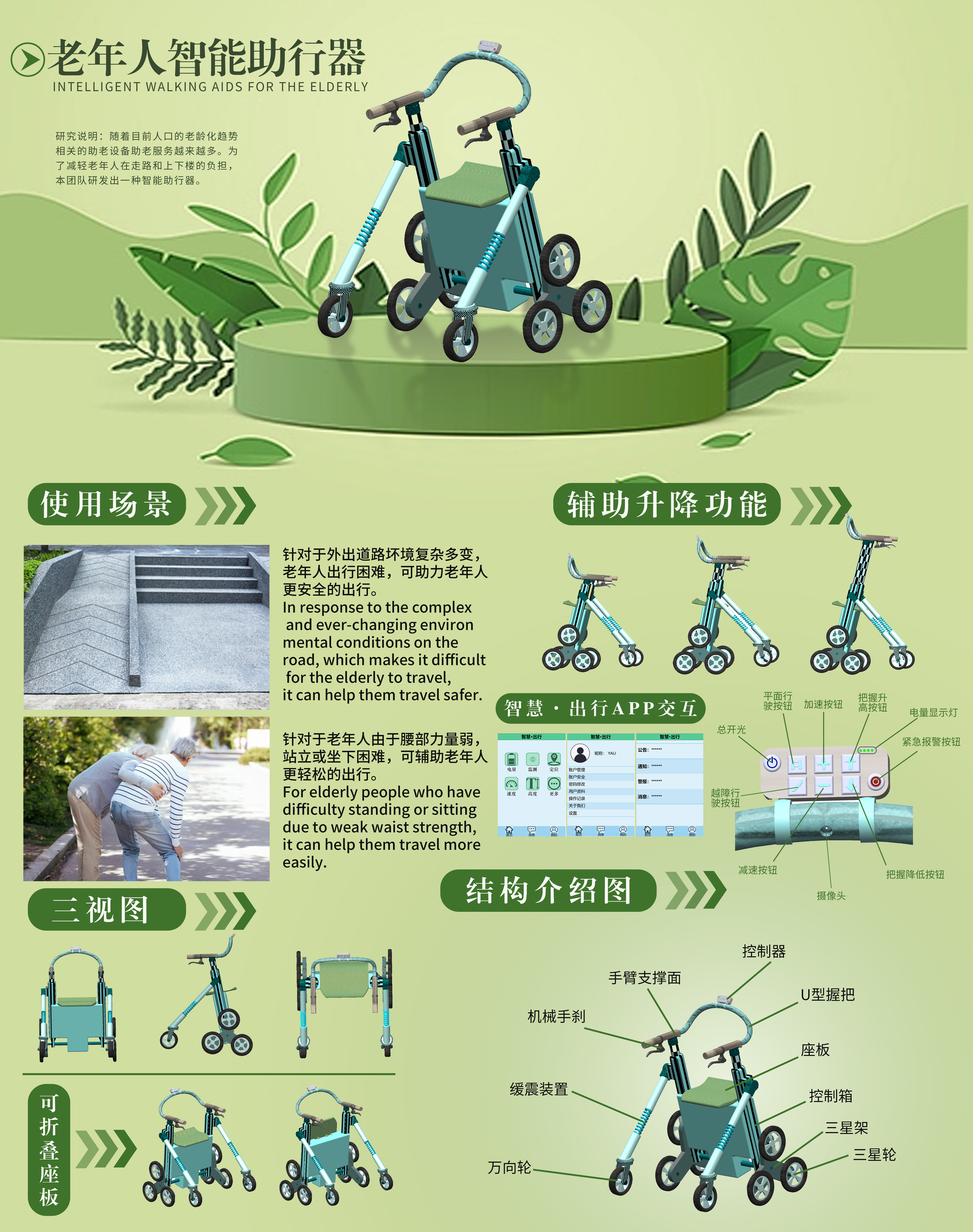 该项目是为老年人设计一款在日常生活中能给与帮助的智能助行器。结构由握把控制部、动力装置、支撑杆三部分组成,握把控制部由符合人体工学的U形握把、功能控制器组成,动力装置由三星轮、万向轮、电机和电源组成,支撑杆由具有减震作用的后支撑梁、可电动调节高度的前支撑梁组成。然后,使用Ansys Workbench进行强度仿真,通过设置应力,发现在极限条件下智能助行器没有失效,性能良好。