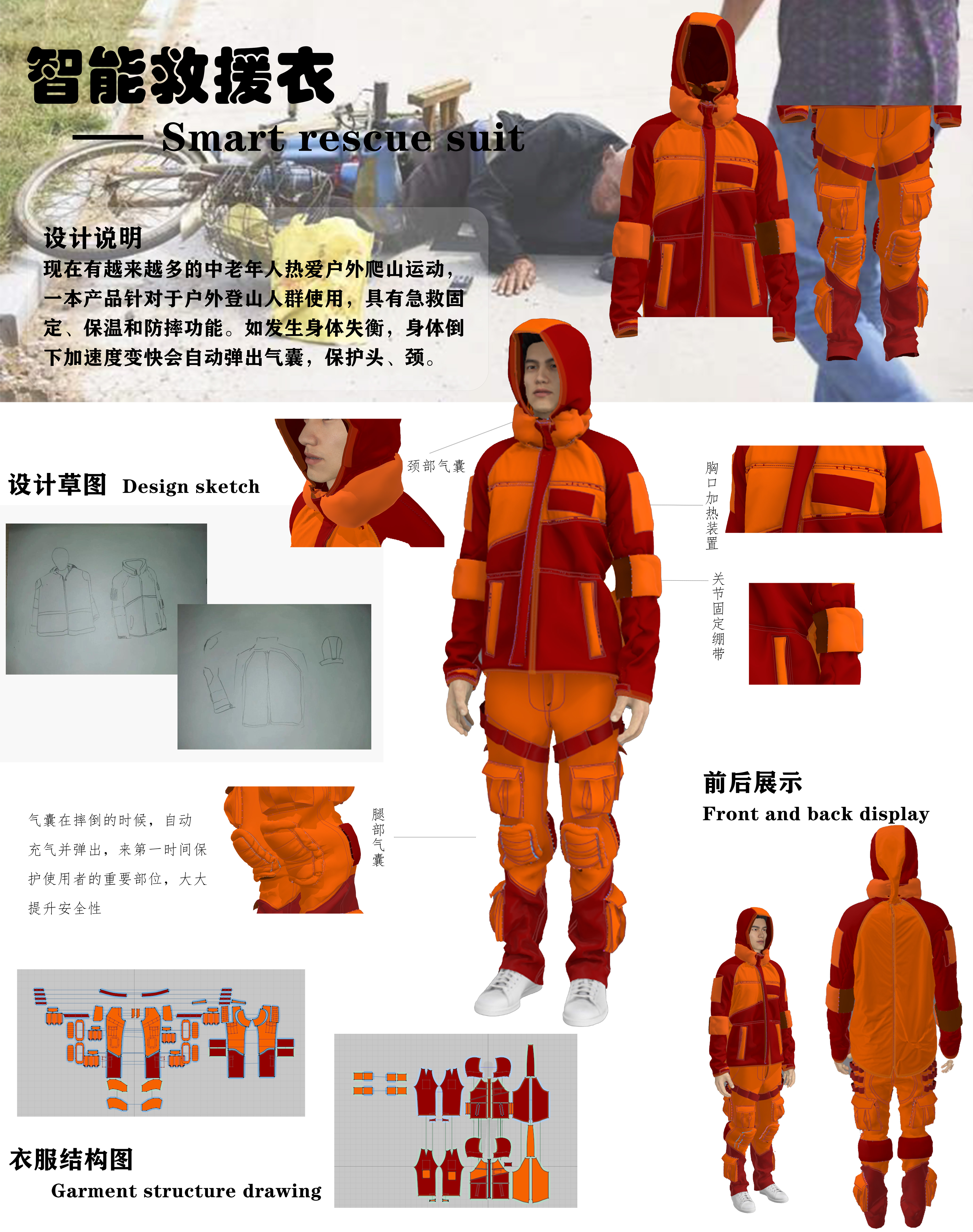 现在有越来越多的中老年人热爱户外爬山运动,一本产品针对于户外登山人群使用,具有急救固定、保温和防摔功能。如发生身体失衡,身体倒下加速度变快会自动弹出气囊,保护头、颈。
