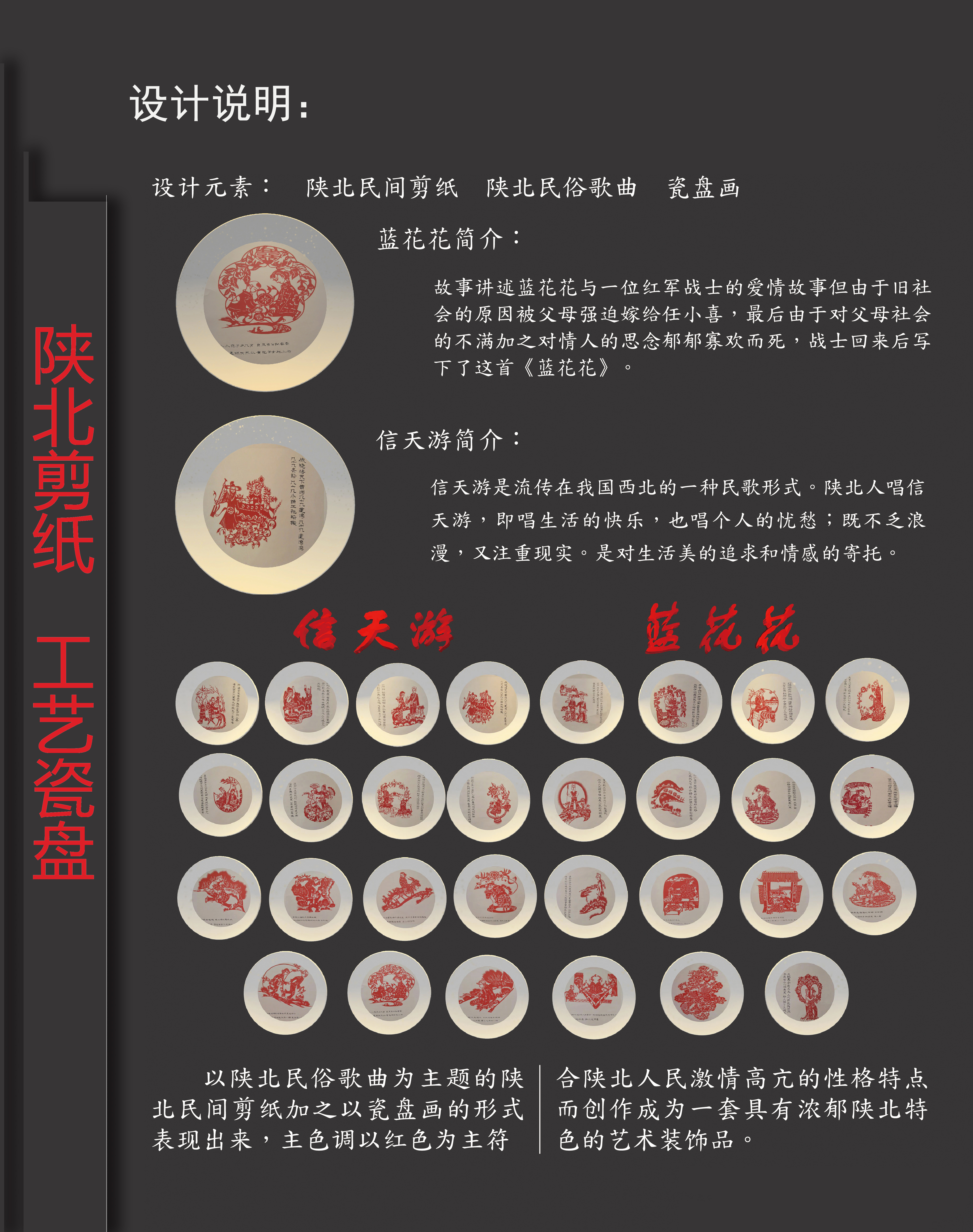 蓝花花简介:故事讲述蓝花花与一位红军战士的爱情故事但由于旧社会的原因被父母强迫嫁给任小喜,最后由于对父母社会的不满加之对情人的思念郁郁寡欢而死,战士回来后写下了这首《蓝花花》。 信天游简介:信天游是流传在我国西北的一种民歌形式。陕北人唱信天游,即唱生活的快乐,也唱个人的忧愁;既不乏浪漫,又注重现实。是对生活美的追求和情感的寄托。 以此创造的一套具有浓郁陕北特色的艺术装饰品。