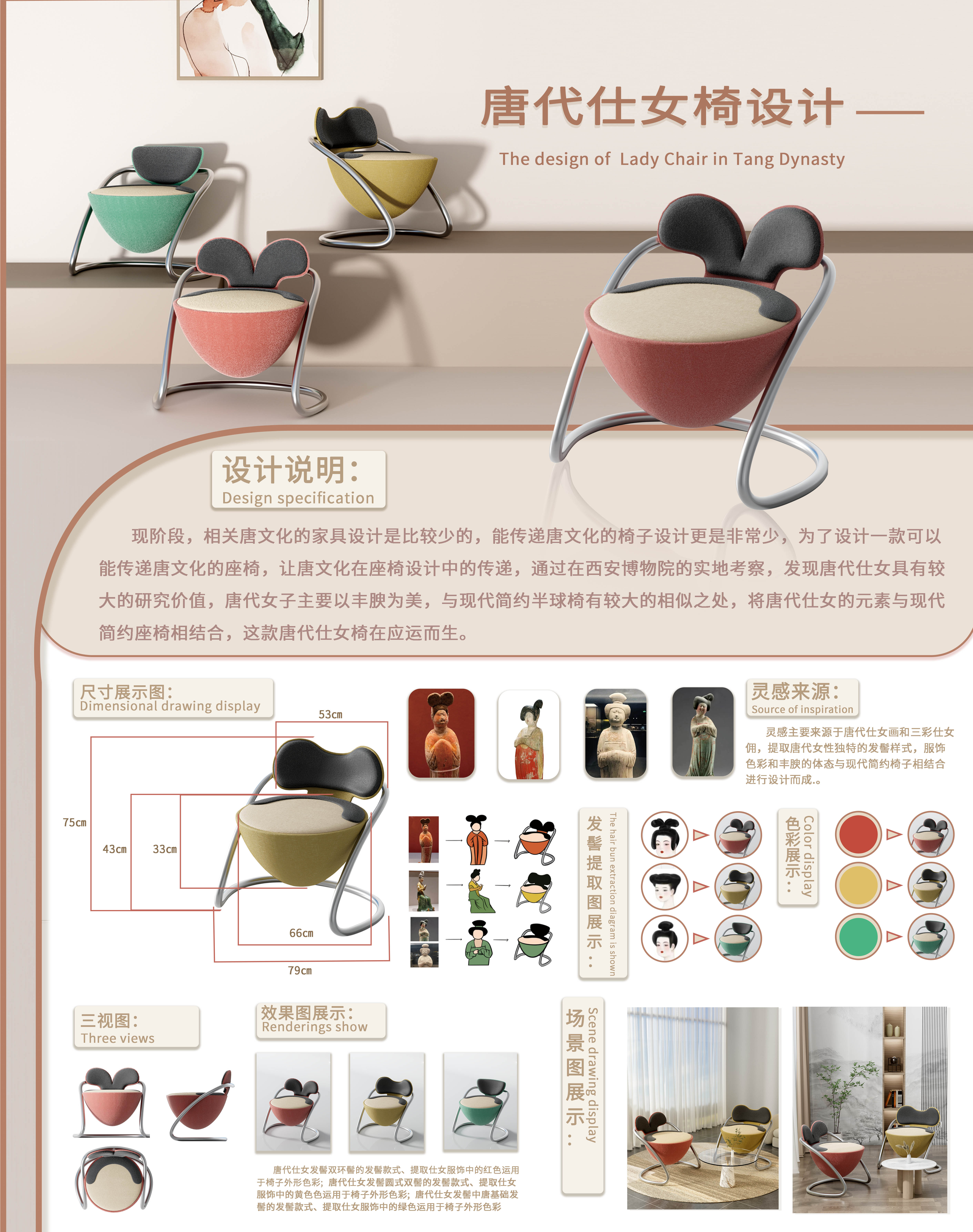现阶段,相关唐文化的家具设计是比较少的,能传递唐文化的椅子设计更是非常少,为了设计一款可以能传递唐文化的座椅,让唐文化在座椅设计中的传递,通过在西安博物院的实地考察,发现唐代仕女具有较大的研究价值,唐代女子主要以丰腴为美,与现代简约半球椅有较大的相似之处,将唐代仕女的元素与现代简约座椅相结合,这款唐代仕女椅在应运而生。
