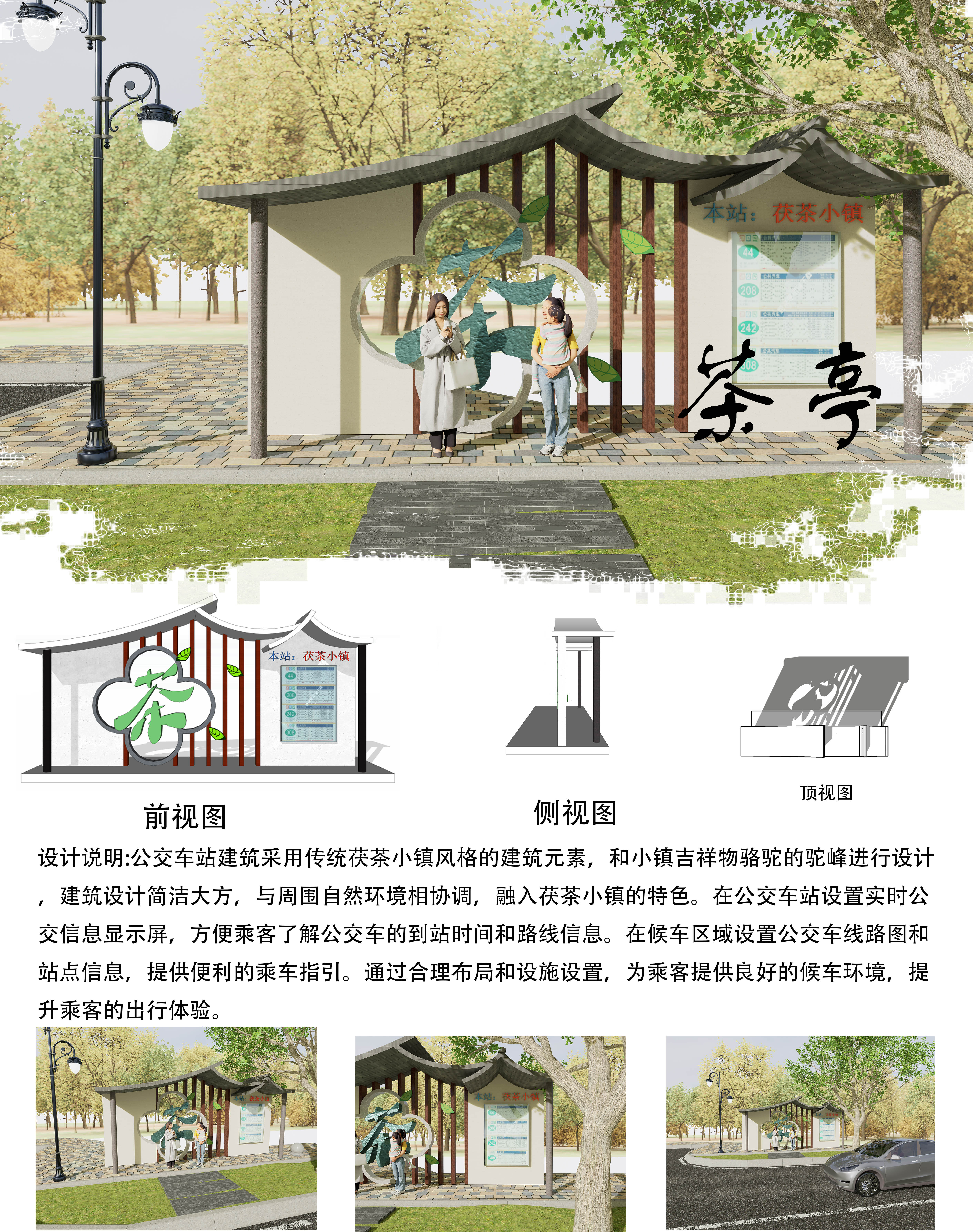 公交车站建筑采用传统茯茶小镇风格的建筑元素,和小镇吉祥物骆驼的驼峰进行设计,建筑设计简洁大方,与周围自然环境相协调,融入茯茶小镇的特色。在公交车站设置实时公交信息显示屏,方便乘客了解公交车的到站时间和路线信息。在候车区域设置公交车线路图和站点信息,提供便利的乘车指引。通过合理布局和设施设置,为乘客提供良好的候车环境,提升乘客的出行体验。