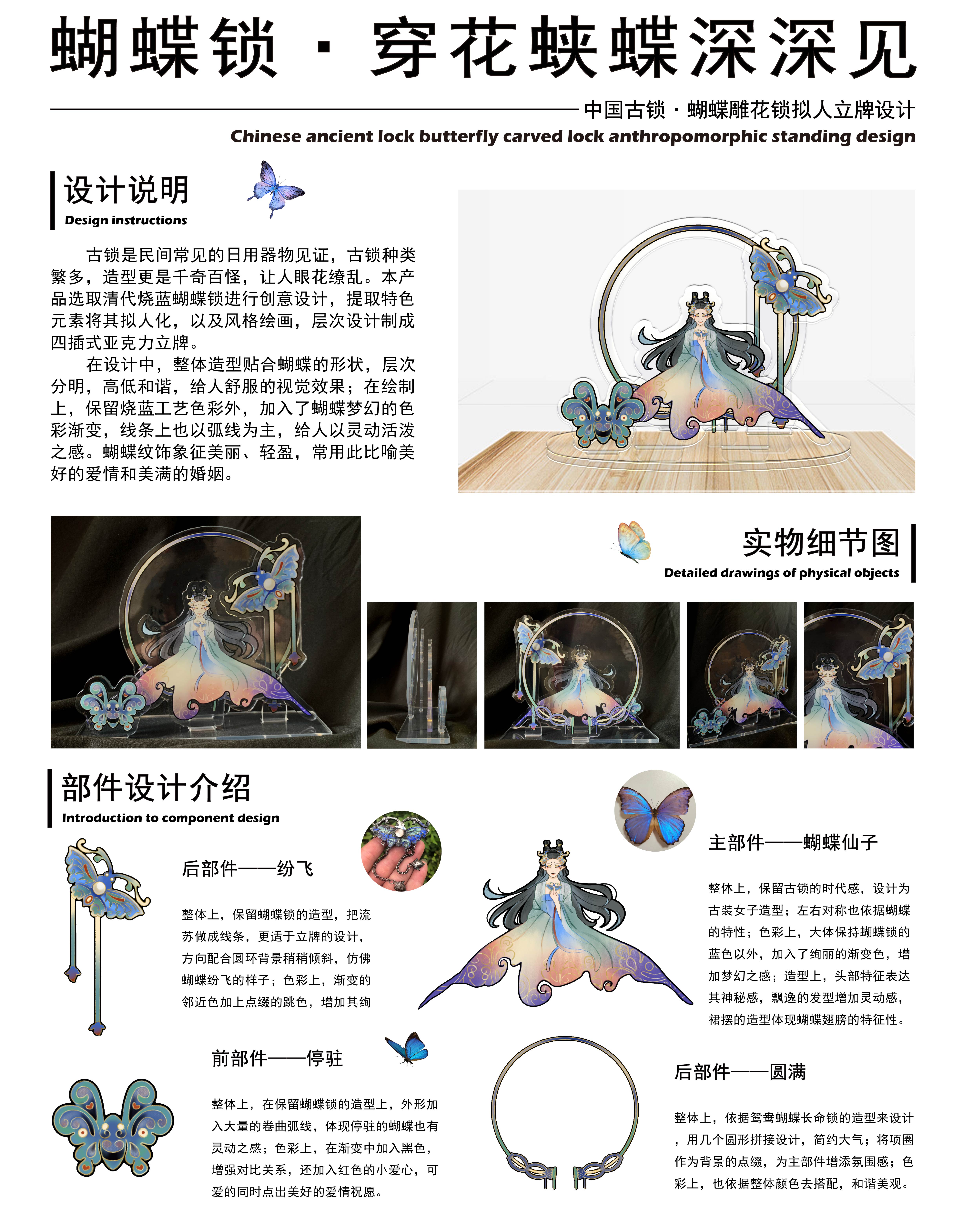 古锁是民间常见的日用器物见证,古锁种类繁多。本产品选取清代烧蓝蝴蝶锁进行创意设计,提取特色元素将其拟人化,以及风格绘画,层次设计制成四插式亚克力立牌。在设计中,整体造型贴合蝴蝶的形状,层次分明,高低和谐,给人舒服的视觉效果;在绘制上,保留烧蓝工艺色彩外,加入了蝴蝶梦幻的色彩渐变,线条上也以弧线为主,给人以灵动活泼之感。蝴蝶纹饰象征美丽、轻盈,常用此比喻美好的爱情和美满的婚姻。
