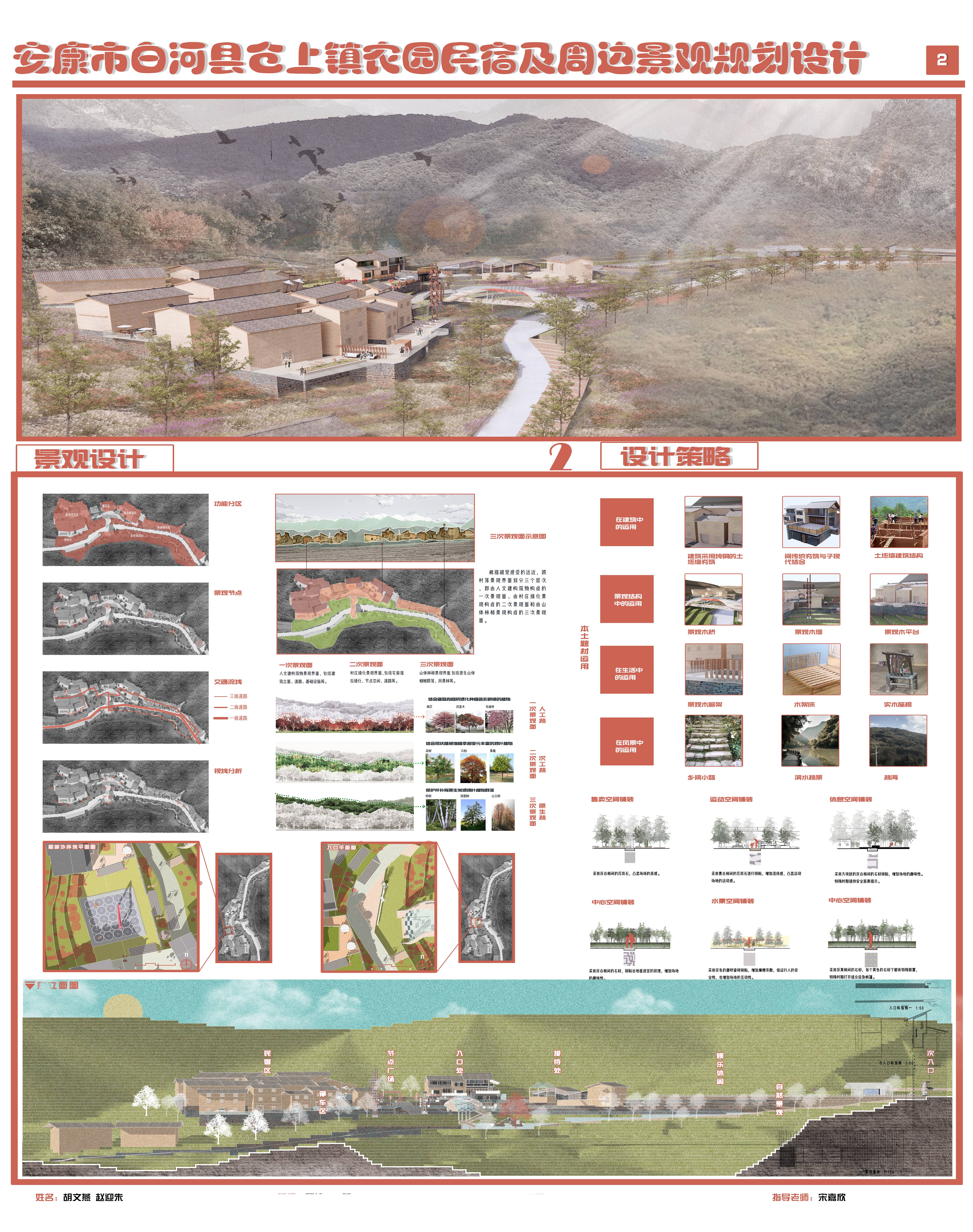 该民宿及周边环境建设是随着乡村地区休闲旅游开发建设应运而生的一种功能性综合环境设计。其内容包括符合性旅游景观、游客接待、居住建筑、休闲餐饮、文化娱乐、小型商业等等和旅游密切相关的综合环境。本项目是以安康市白河县仓上镇天宝梯彩农园景区建设为契机和背景而开发的一个集休闲、观光、住宿、体验等内容的综合项目,本设计将打造一个集村民居住、游客旅游、可持续发展的村落,体现当地文化特色。