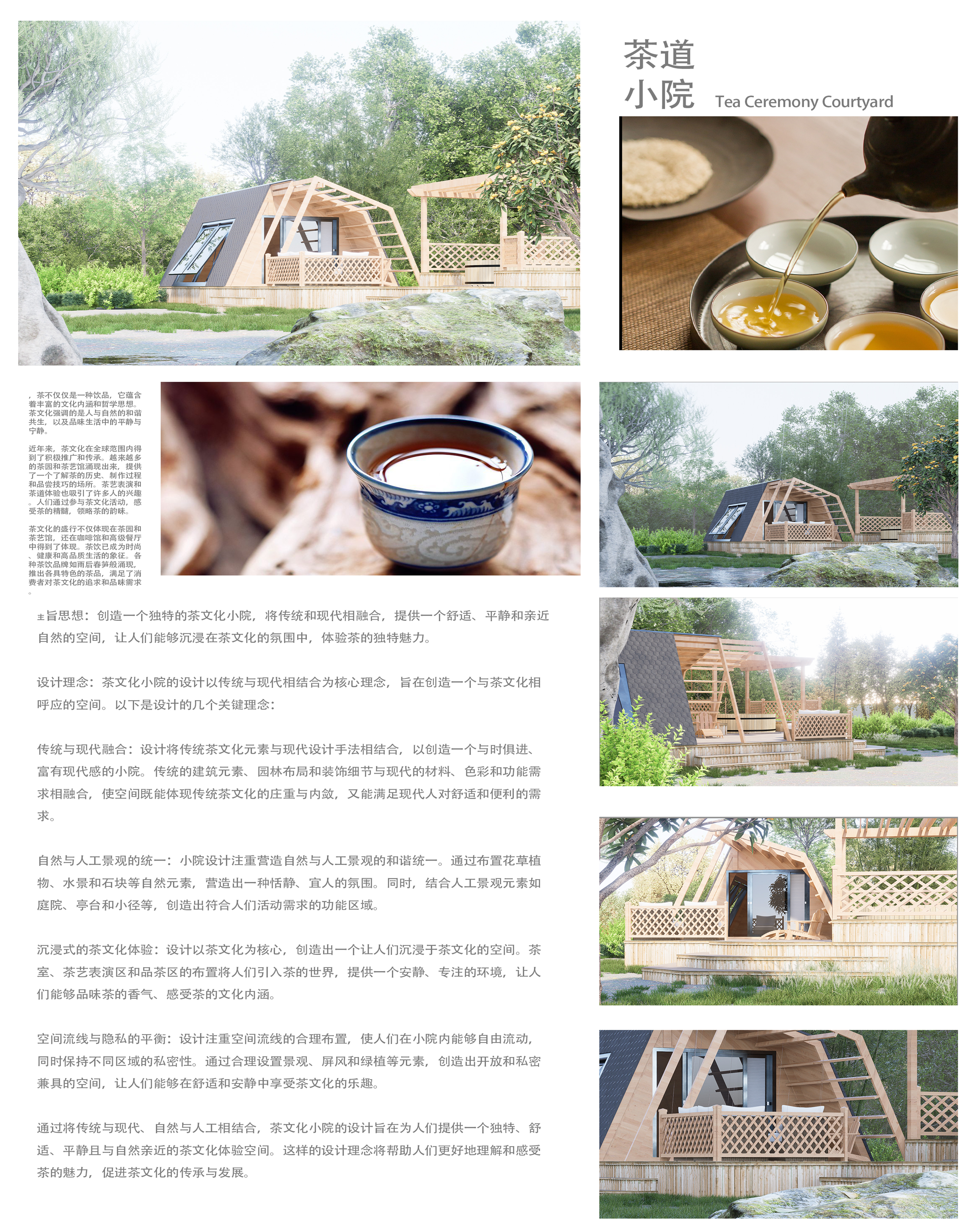 设计理念: 喝茶小院的设计旨在创造一个远离城市喧嚣的安静空间,为人们提供一个放松、品味和交流的场所。以下是设计的主要理念: 自然与人工的融合:通过将自然元素与人工结构相融合,营造一个与自然和谐共生的环境。通过植物、水景和天然材料的运用,打造绿意盎然的庭院,让人们感受到大自然的美妙。