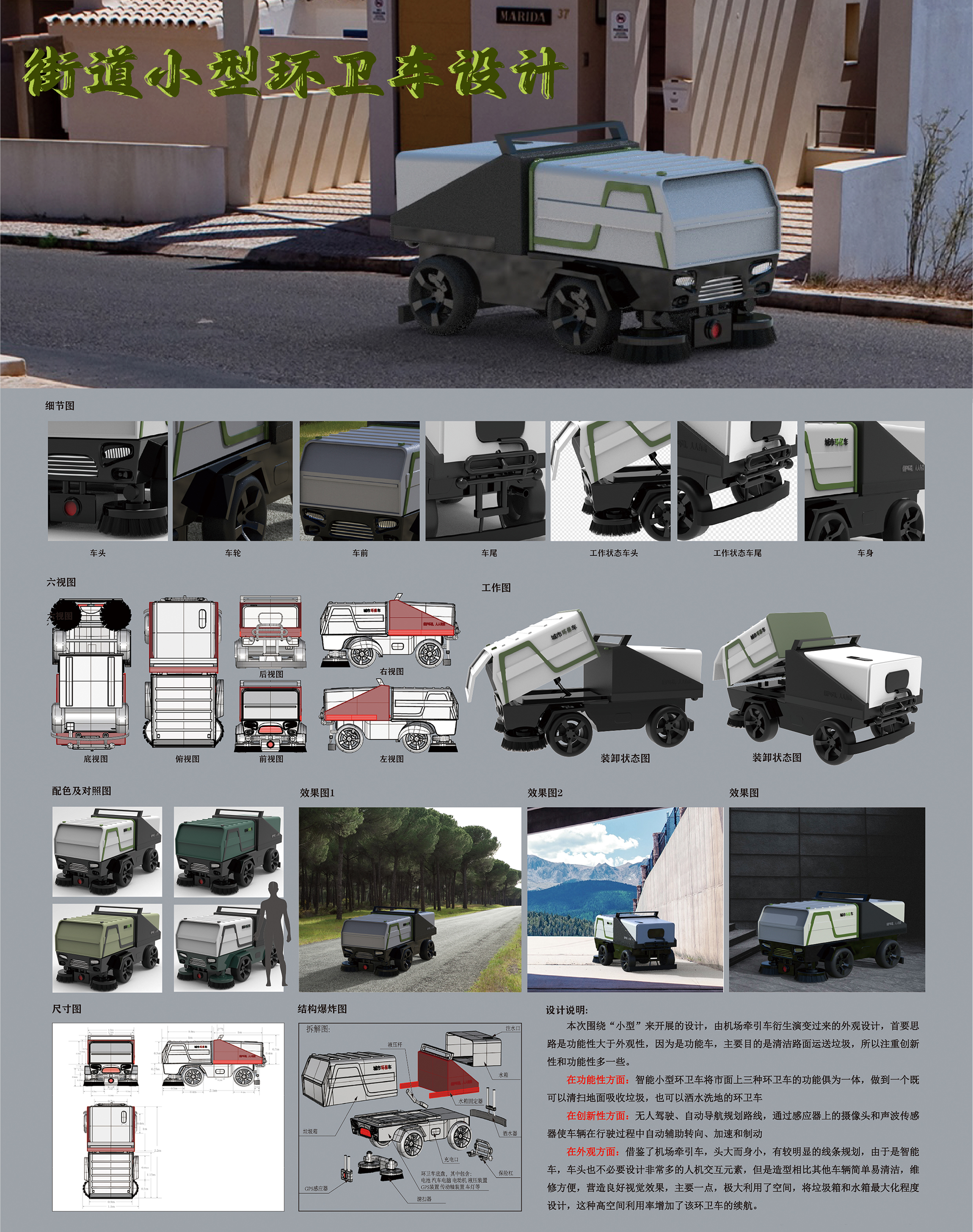 本次围绕“小型”展开设计,由机场牵引车演变过来的外观设计,主要目的是清洁路面运送垃圾。 功能性:将市面上三种环卫车的功能俱为一体,做到既可以清扫地面吸收垃圾,也可以洒水洗地的环卫车 创新性:无人驾驶、自动导航规划路线,通过感应器的摄像头和声波传感器使车辆在行驶过程中自动辅助转向、加速和制动 外观:借鉴机场牵引车,造型比其他车辆简单,将垃圾箱和水箱最大化程度设计,高空间利用率增加了该环卫车的续航。