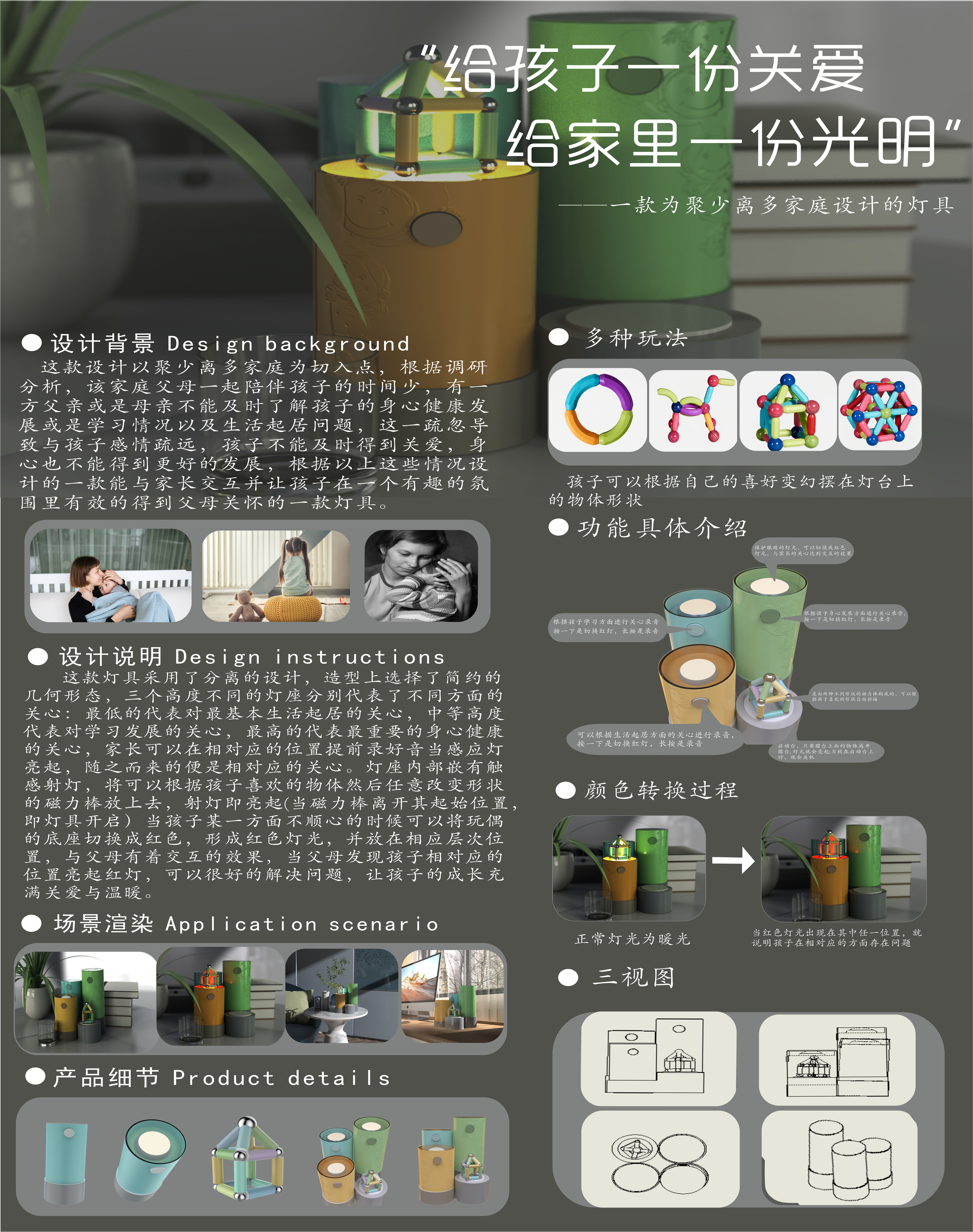 这款灯的设计选用几何体低的代表对最基本生活起居的关心,中等高度关心:代表对学习发展的关心,最高的代表最重要的身心健康的关心,灯座内部嵌有触感射灯,将可以根据孩子喜欢的物体然后任意改变形状的磁力棒放上去,射灯即亮起当孩子某一方面不顺心的时候可以将玩偶的底座切换成红色,形成红色灯光,并放在相应层次位置,与父母有当父母发现孩子相对应的位置亮起红灯可以很好的解决问题让孩子的成长充满关爱与温暖