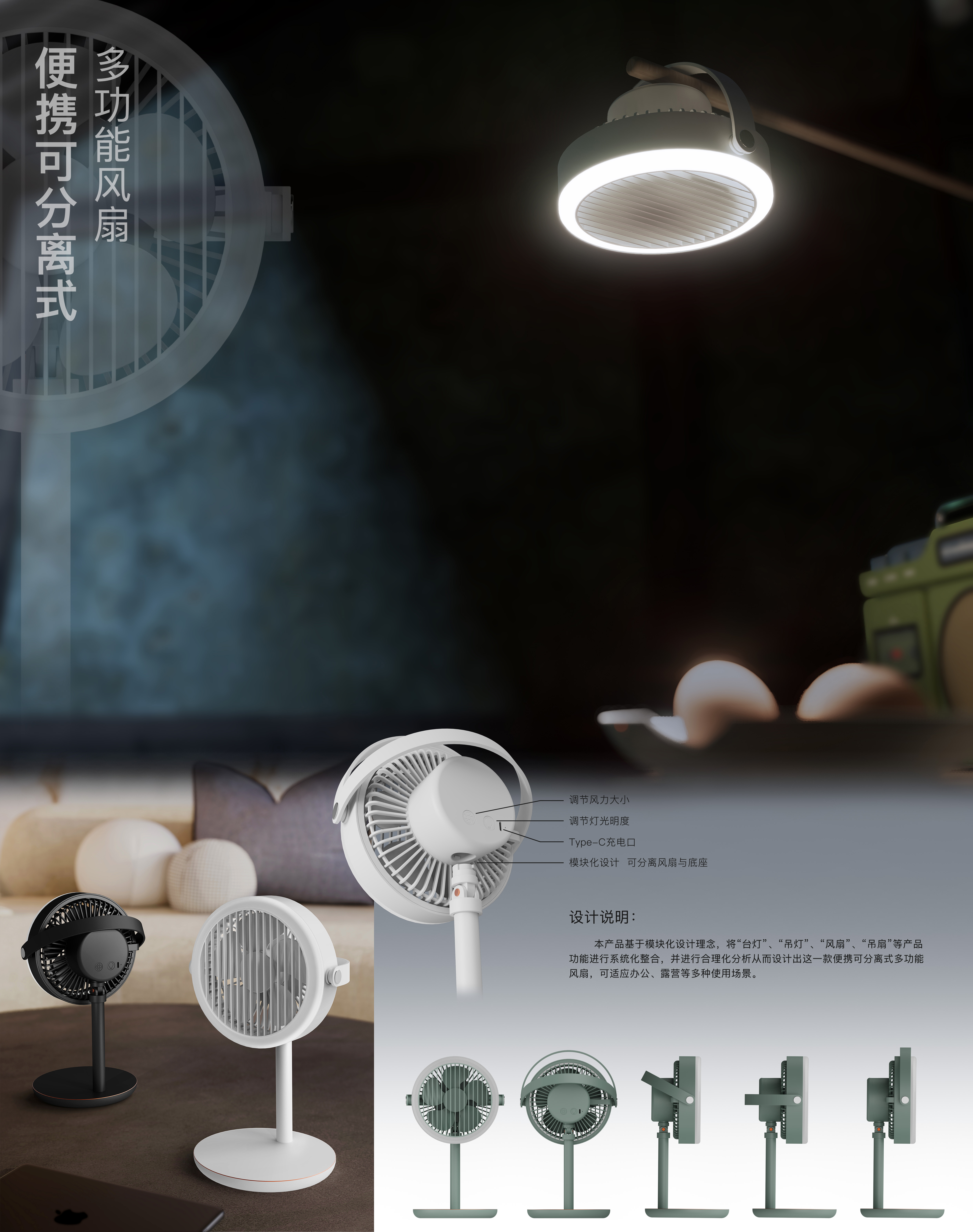 本产品基于模块化设计理念,将“台灯”、“吊灯”、“风扇”、“吊扇”等产品功能进行系统化整合,并进行合理化分析从而设计出这一款便携可分离式多功能风扇,可适应办公、露营等多种使用场景。