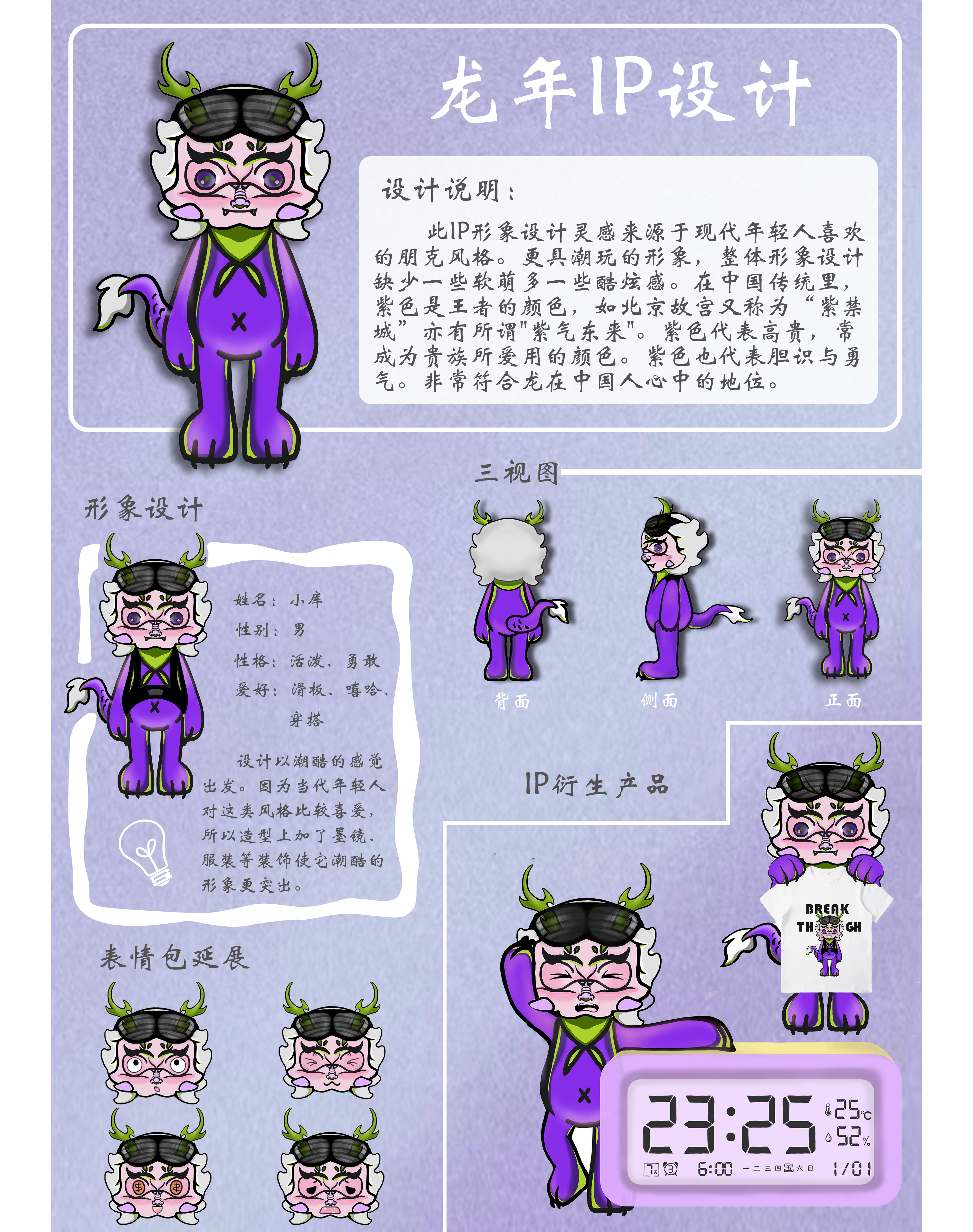 此IP形象设计灵感来源于陕西历史博物馆鎏金铜龙,符合现代年轻人喜欢的朋克风格。更具潮玩的形象,整体形象设计更多一些酷炫感。在中国传统里,紫色是王者的颜色,如北京故宫又称为“紫禁城亦有所谓"紫气东来"。紫色代表高贵,常成为贵族所爱用的颜色。紫色也代表胆识与勇非常符合龙在中国人心中的地位。设计以潮酷的感觉出发。因为当代年轻人对这类风格比较喜爱所以造型上加了墨镜.服装等装饰使它潮酷的形象更突出。
