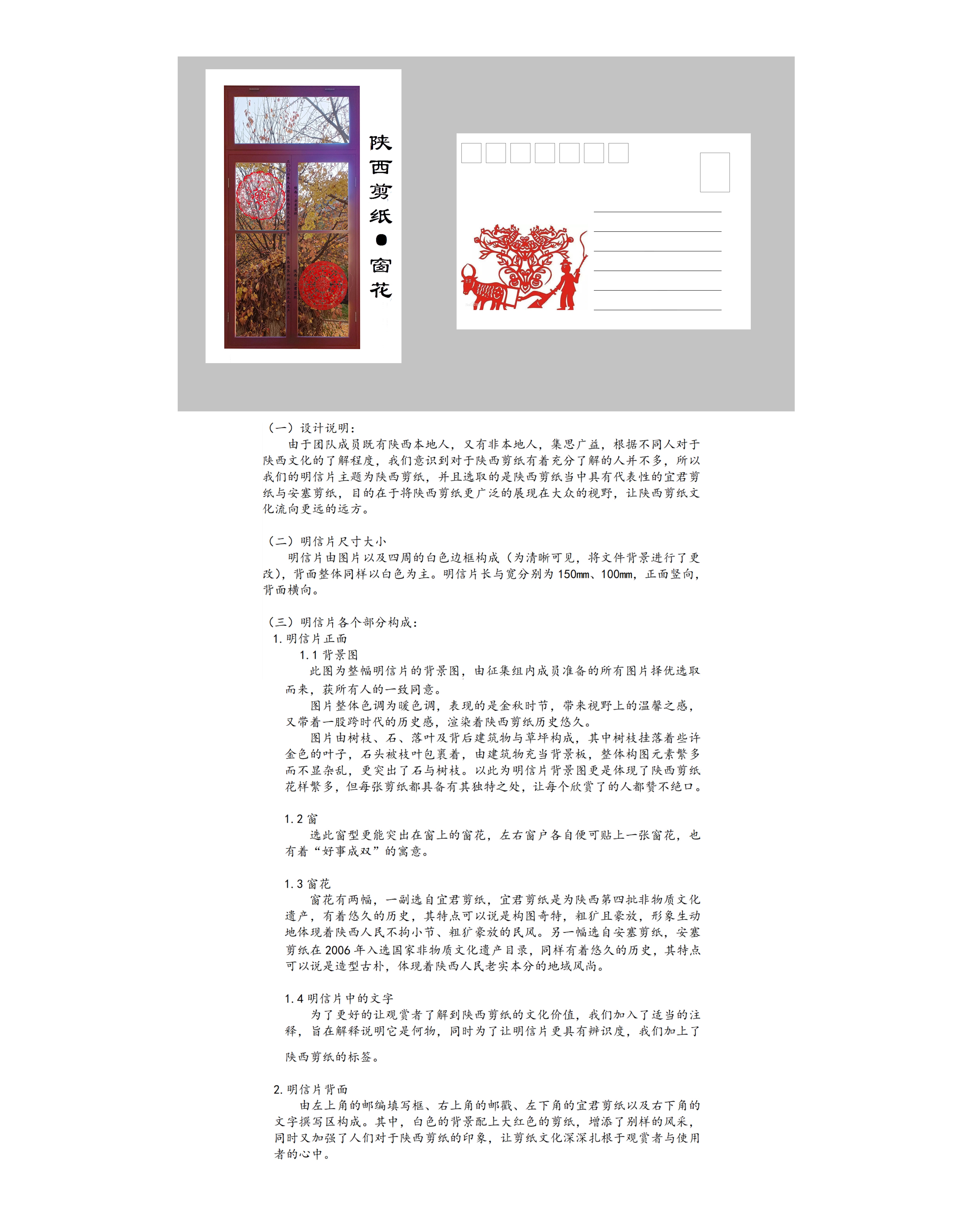 作品名为窗花剪纸明信片。 由于团队成员既有陕西本地人,又有非本地人,集思广益,根据不同人对于陕西文化的了解程度,我们意识到对于陕西剪纸有着充分了解的人并不多,所以我们的明信片主题为陕西剪纸,并且选取的是陕西剪纸当中具有代表性的宜君剪纸与安塞剪纸,目的在于将陕西剪纸更广泛的展现在大众的视野,让陕西剪纸文化流向更远的远方。