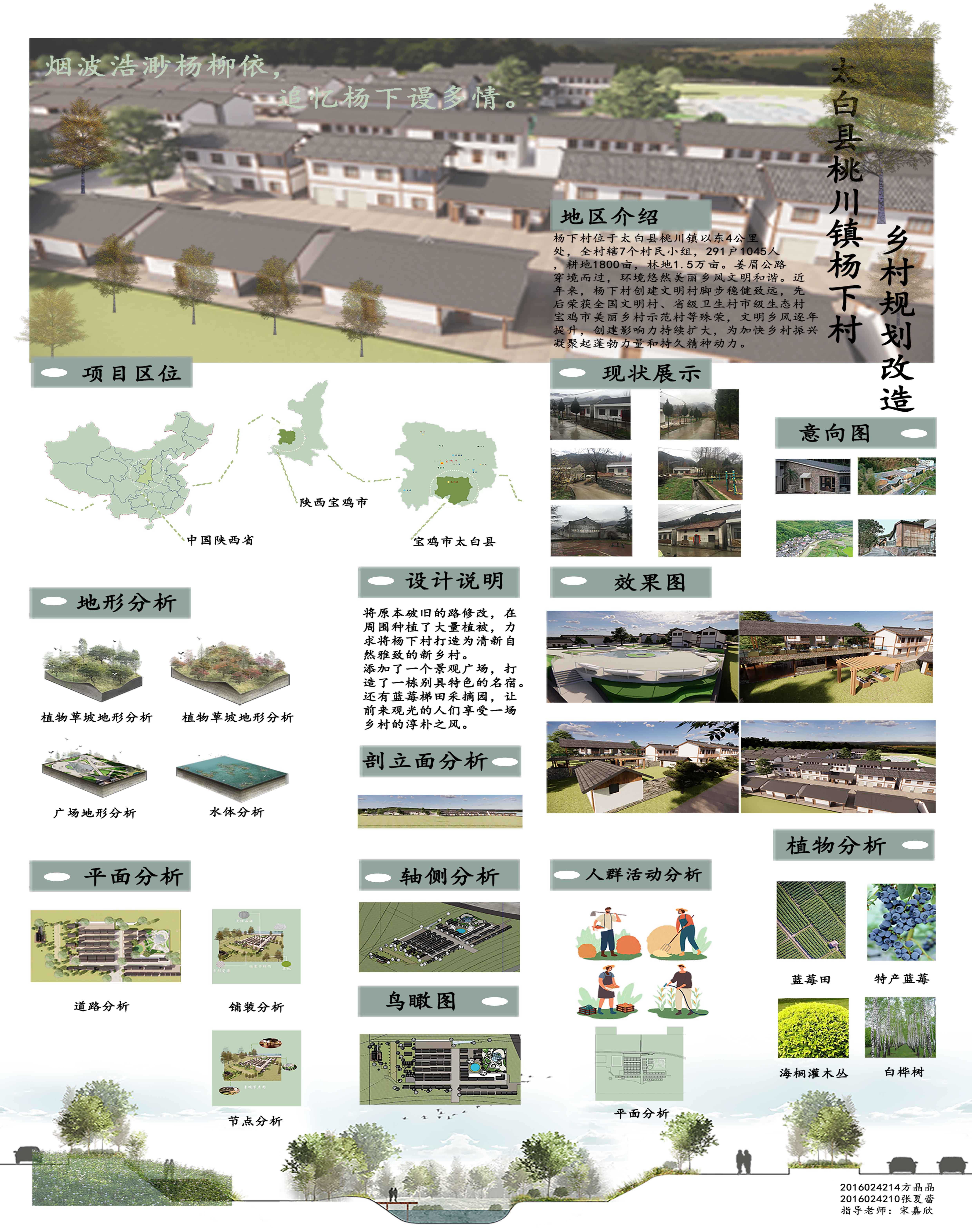 对杨下村进行乡村景观规划改造设计,整体道路规划呈现环带状,将居民住宅包围在四通八达的道路中,周边设置景观广场供居民休憩使用。整体添加了大量的绿化,为整个杨下村增添了活力。