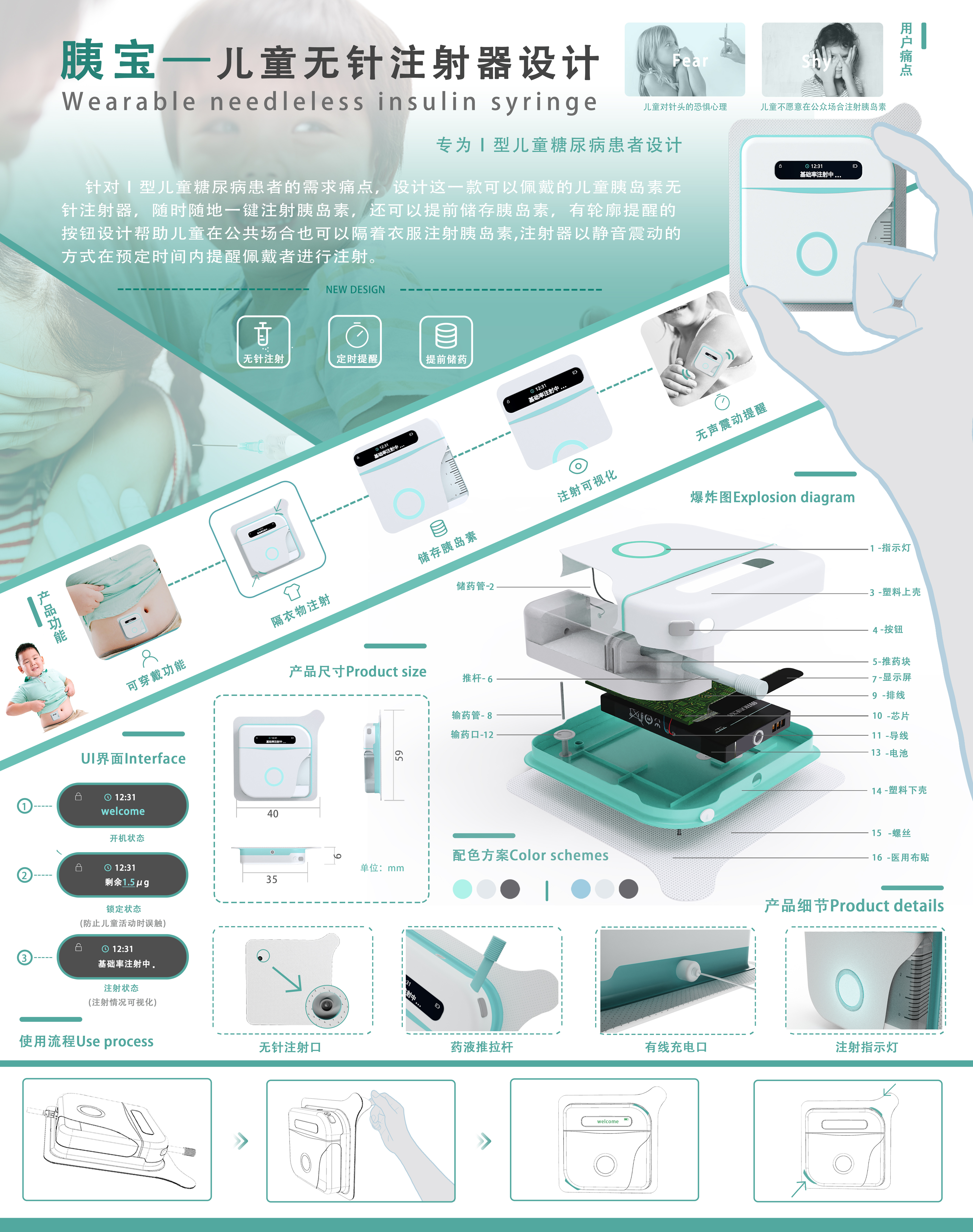 针对1型儿童糖尿病患者的需求痛点,设计这一款可以佩 戴的儿童胰岛素无针注射器,随时随地一键注射胰岛素,还 可以提前储存胰岛素,有轮廓提醒的按钮设计帮助儿童在公 共场合也可以隔着衣服注射胰岛素,注射器以静音震动的方式 在预定时间内提醒佩戴者进行注射。