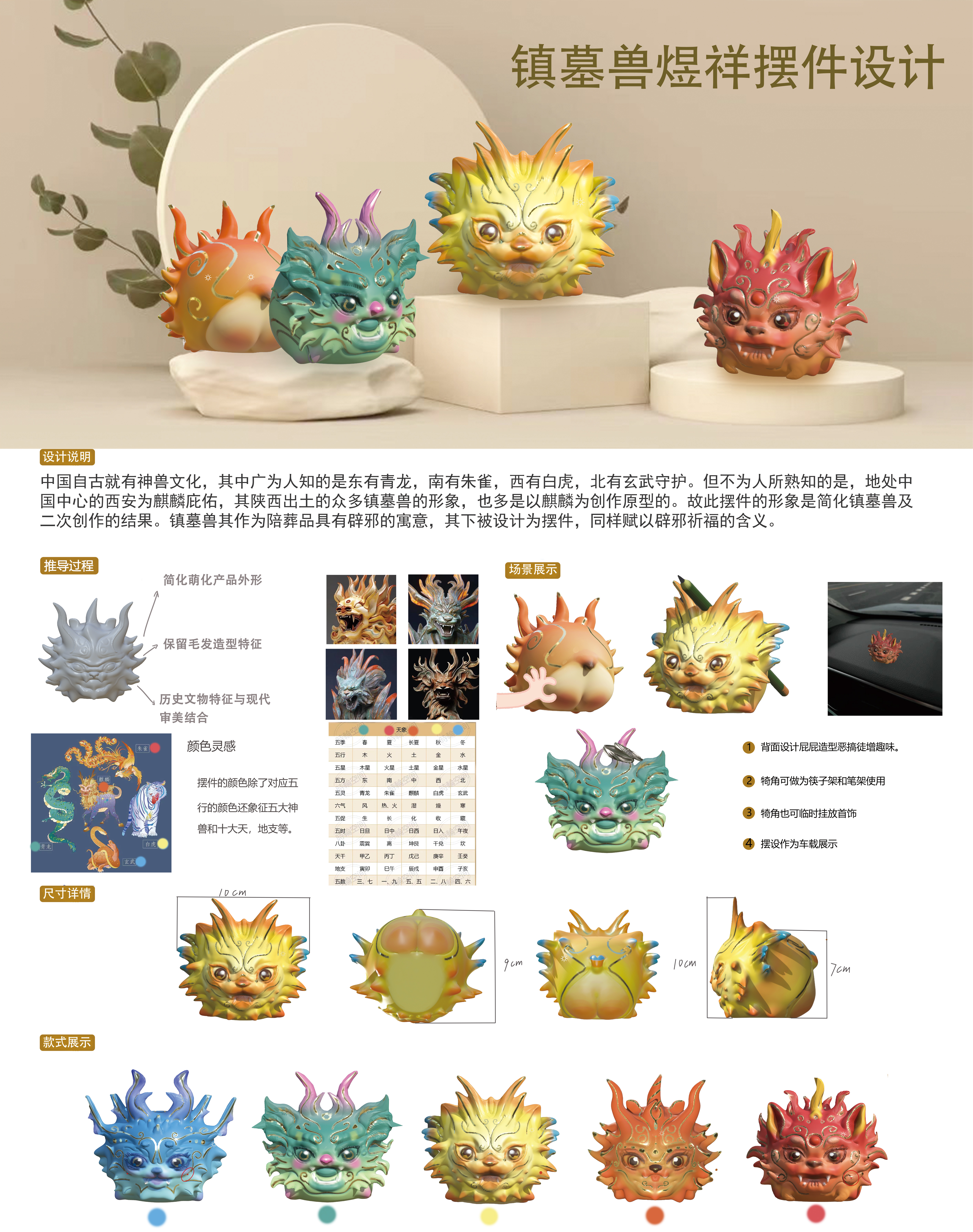 中国自古就有神兽文化,其中广为人知的是东有青龙,南有朱雀,西有白虎,北有玄武守护。但不为人所熟知的是,地处中国中心的西安为麒麟庇佑,其陕西出土的众多镇墓兽的形象,也多是以麒麟为创作原型的。故此摆件的形象是简化镇墓兽及二次创作的结果。镇墓兽其作为陪葬品具有辟邪的寓意,其下被设计为摆件,同样赋以辟邪祈福的含义。