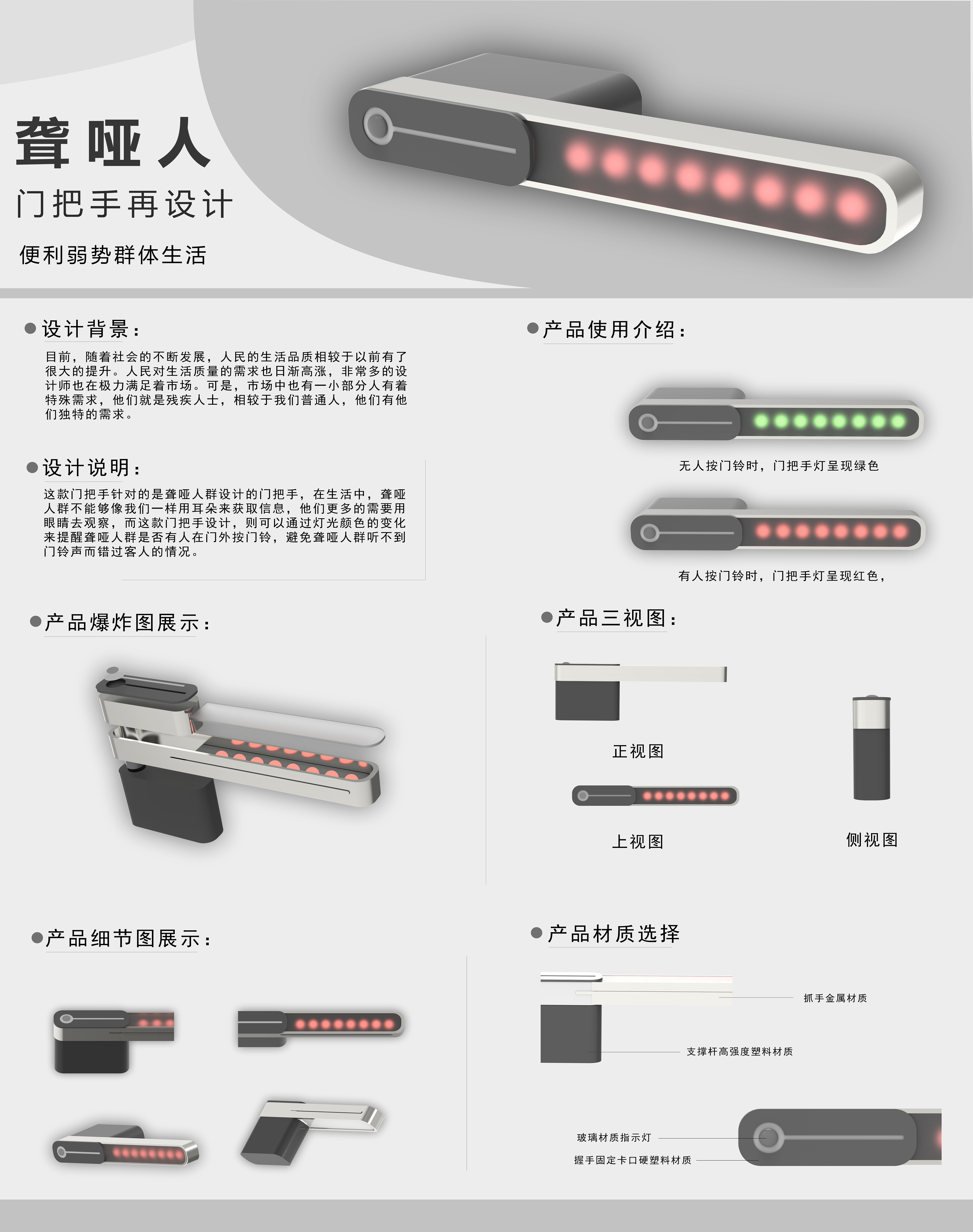 这款门把手针对的是聋哑人群设计的门把手,在生活中,聋哑人群不能够像我们一样用耳朵来获取信息,他们更多的需要用眼睛去观察,而这款门把手设计,则可以通过灯光颜色的变化来提醒聋哑人群是否有人在门外按门铃,避免聋哑人群听不到门铃声而错过客人的情况。