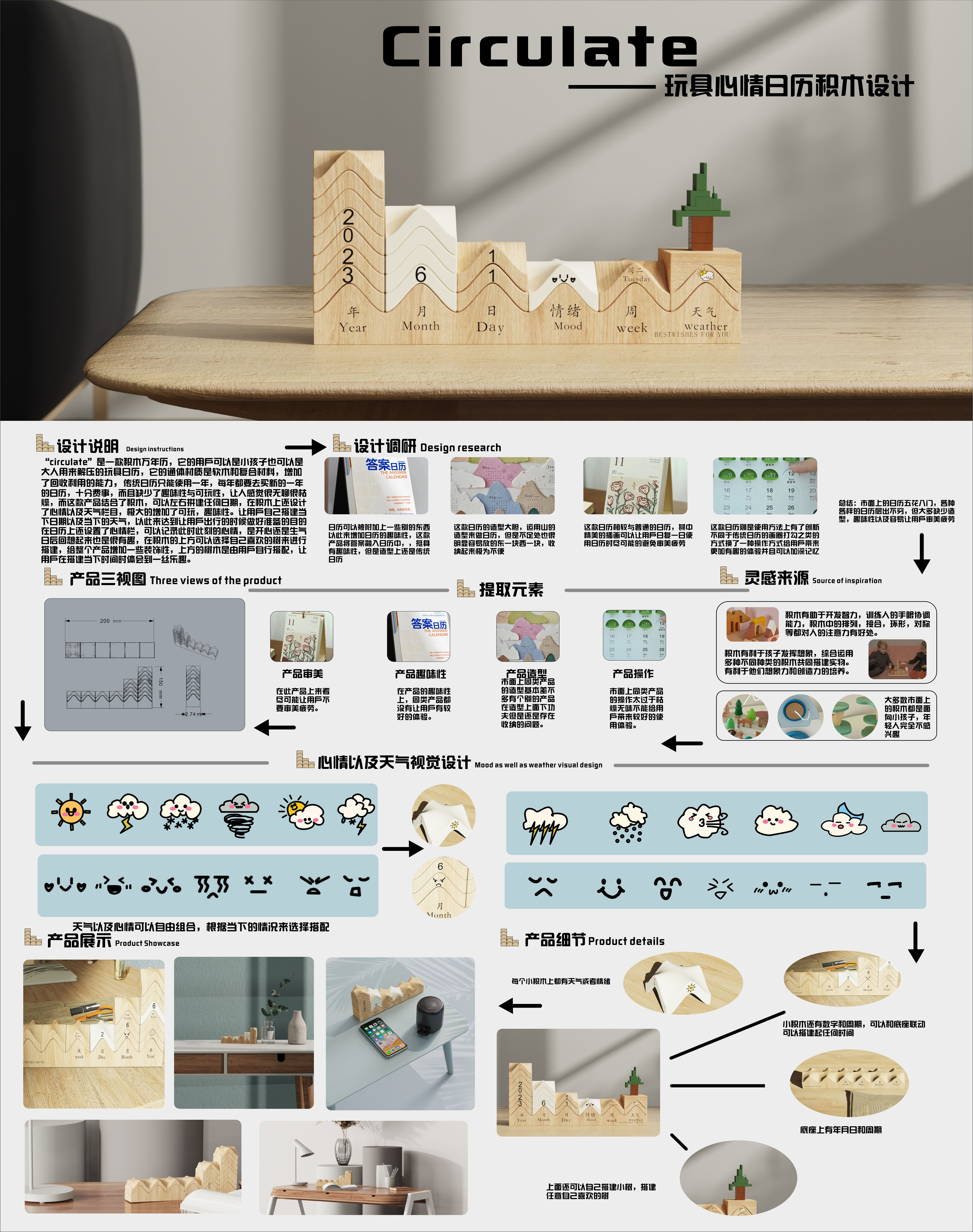 “circulate”是一款积木万年历,它的用户可以是小孩子也可以是大人用来解压的玩具日历,它的通体村质是软木和复合材料,增加了回收利用的能力,传统日历只能使用一年,每年都要去买新的一年的日历,十分费事,而且缺少了趣味性与可玩性,让人感觉很无聊很枯燥,而这款产品结合了积木,可以左右拼建任何日期,在积木上还设计了心情以及天气栏目,极大的增加了可玩,趣味性。