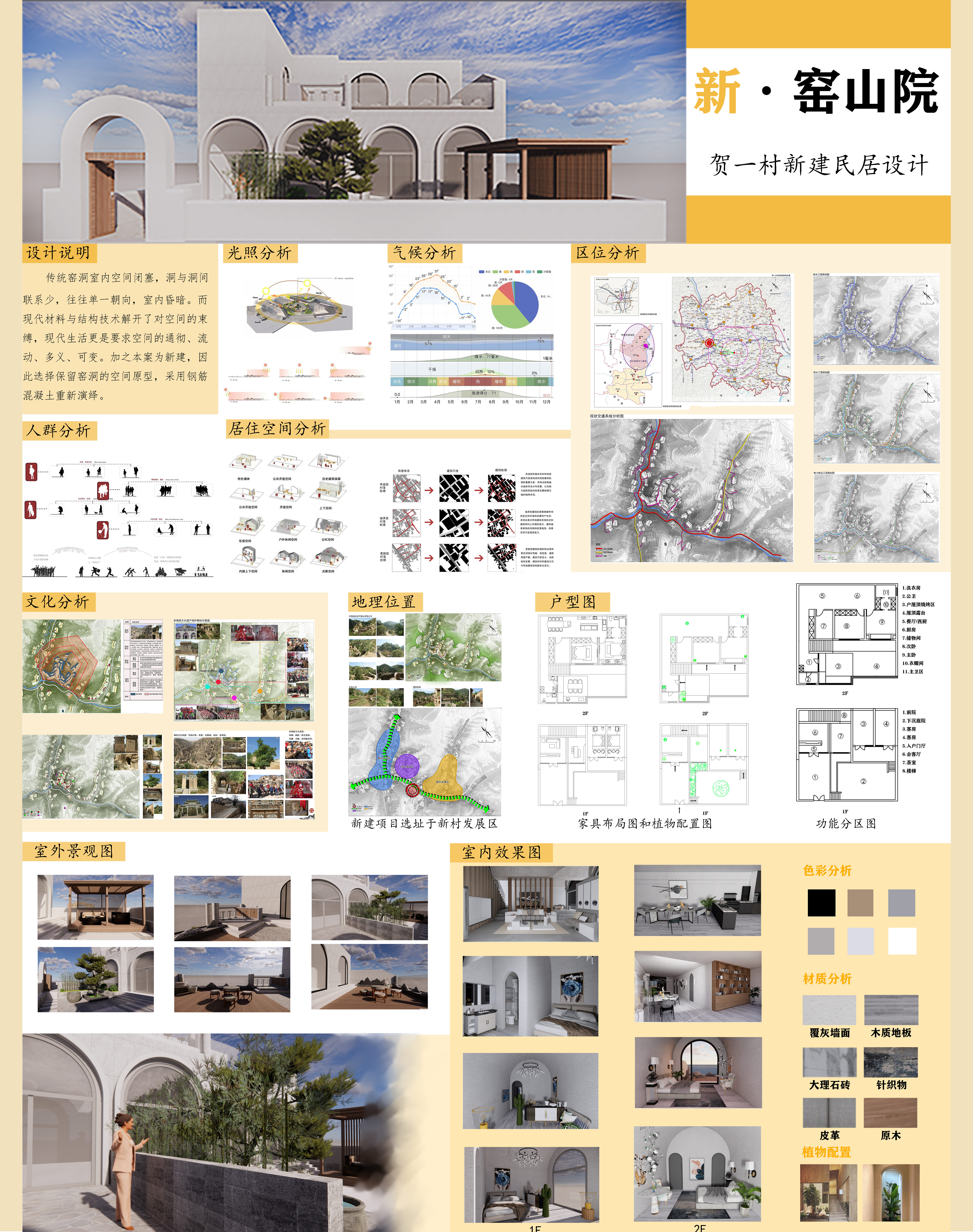 方案依托贺一村深厚的人文底蕴充分发挥“美丽乡村”建设与城镇化二者优势,方案选址为村落党氏庄园窑洞合院群落保护区以外对面山腰闲置地带。传统窑洞室内空间闭塞,往往单一朝向,室内昏暗。而现代材料与结构技术解开了对空间的束缚,现代生活更是要求空间的通彻、流动、多义、可变。该设计从建筑形式、体量、色彩、装饰等各方面与历史建筑相协调,以保持和维护传统村落的历史风貌,将这一历史建筑文化得以延继和承续。