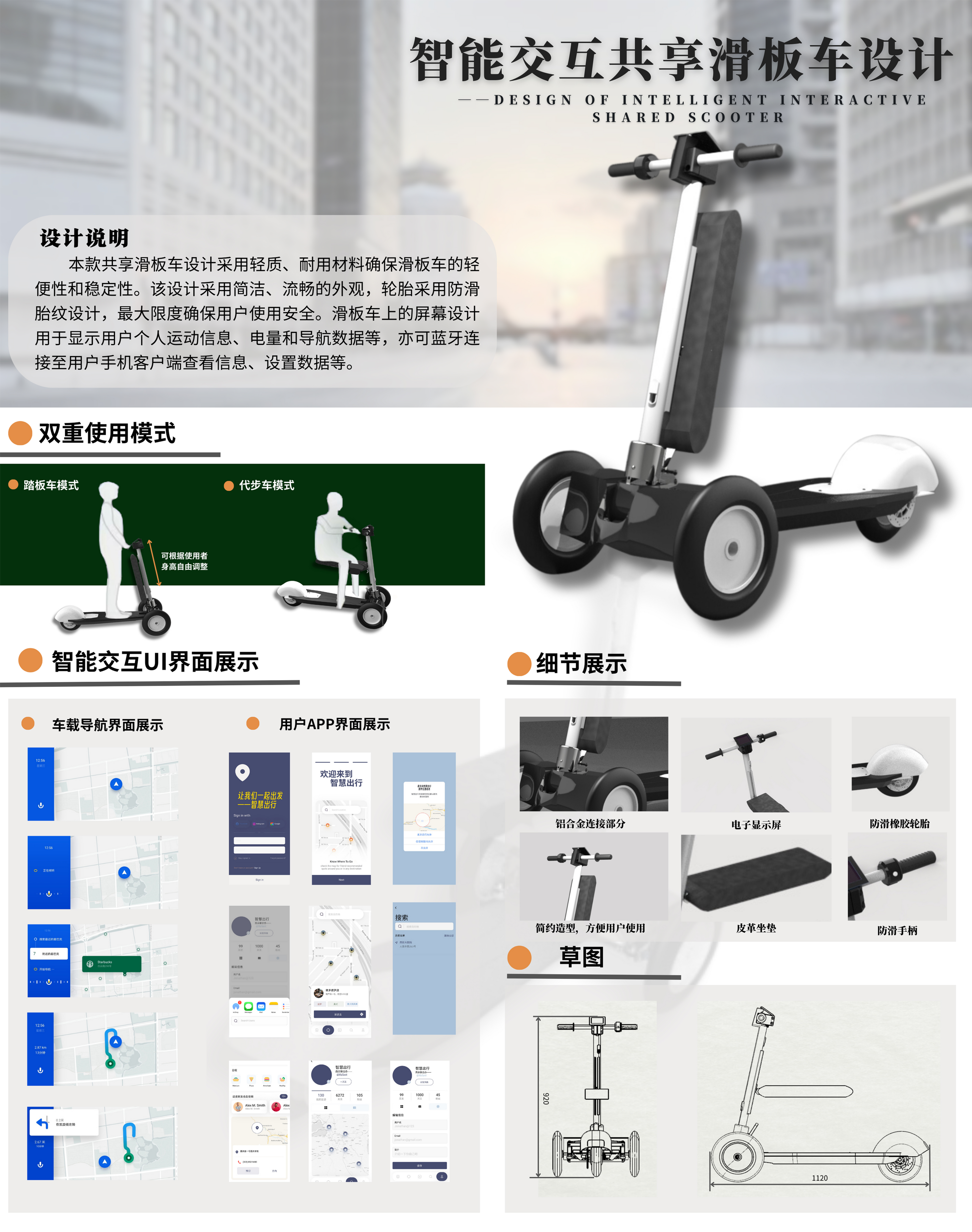 本款共享滑板车设计采用轻质、耐用材料确保滑板车的轻便性和稳定性;同时使用皮制可折叠的灵活座椅,两种出行形态可供用户选择,最大限度提高用户在使用时的切身感受。滑板车上的屏幕设计用于显示用户个人的运动信息、滑板车剩余电量及导航数据等,亦可蓝牙连接至用户手机客户端同步使用。