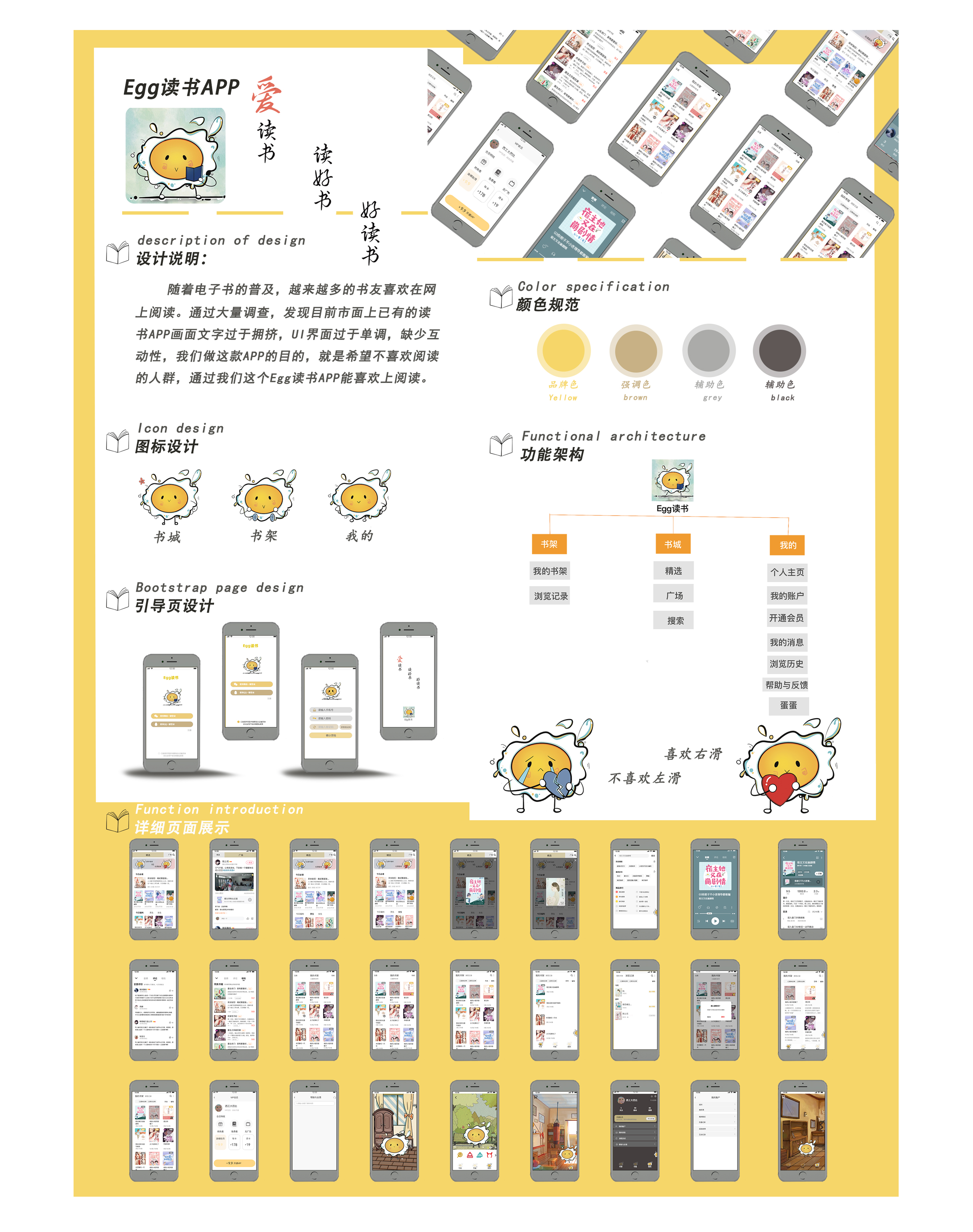 随着电子书的普及,越来越多的书友喜欢在网上阅读。通过大量调查,发现目前市面上已有的读书APP画面文字过于拥挤,UI界面过于单调,缺少互动性,我们做这款APP的目的,就是希望不喜欢阅读的人群,通过我们这个Egg读书APP能喜欢上阅读。