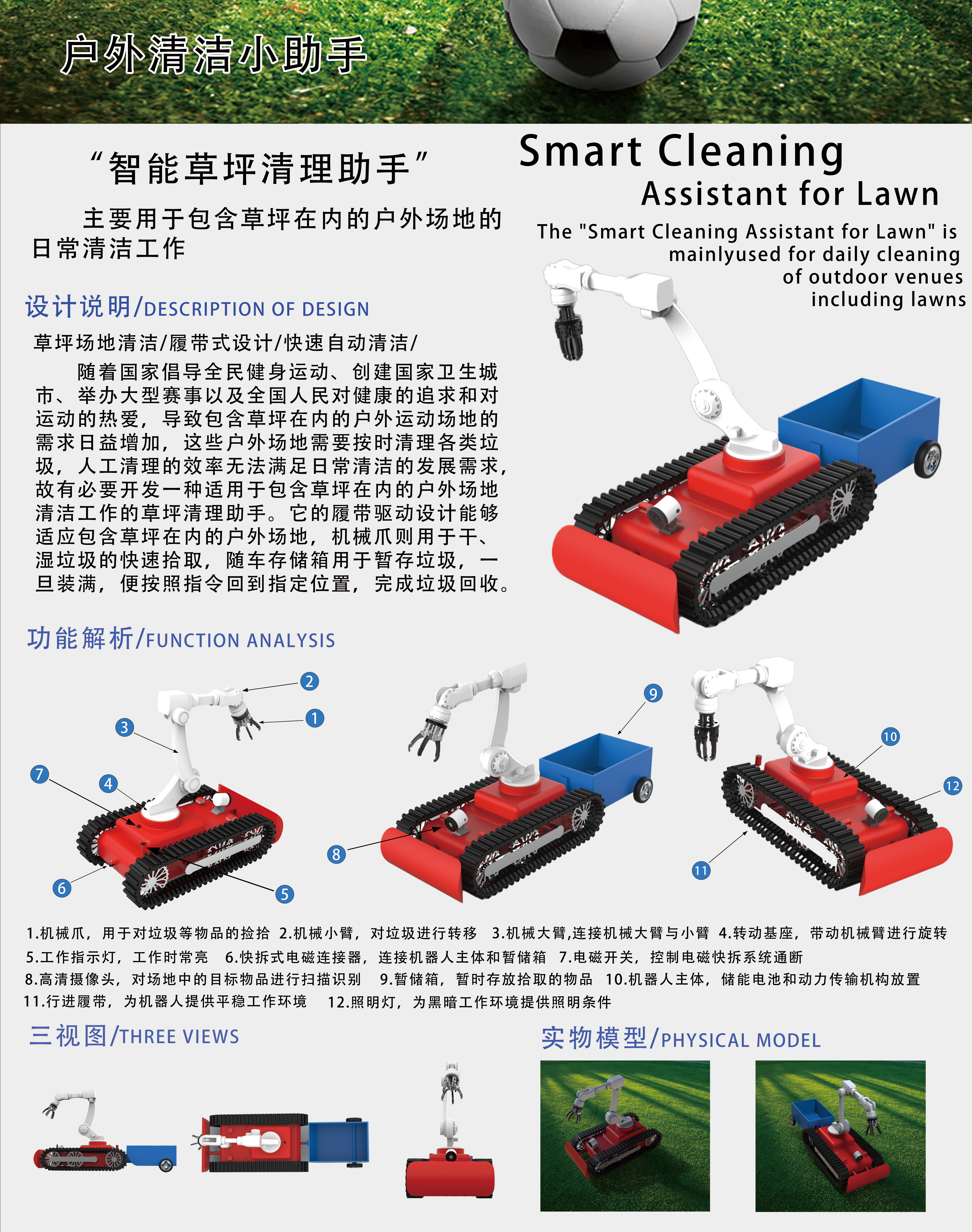 随着国家倡导全民健身运动、创建国家卫生城市、举办大型赛事以及全国人民对健康的追求和对运动的热爱,导致包含草坪在内的户外运动场地的需求日益增加,这些户外场地需要按时清理各类垃圾,人工清理的效率无法满足日常清洁的发展需求,故有必要开发一种适用于包含草坪在内的户外场地清洁工作的草坪清理助手。