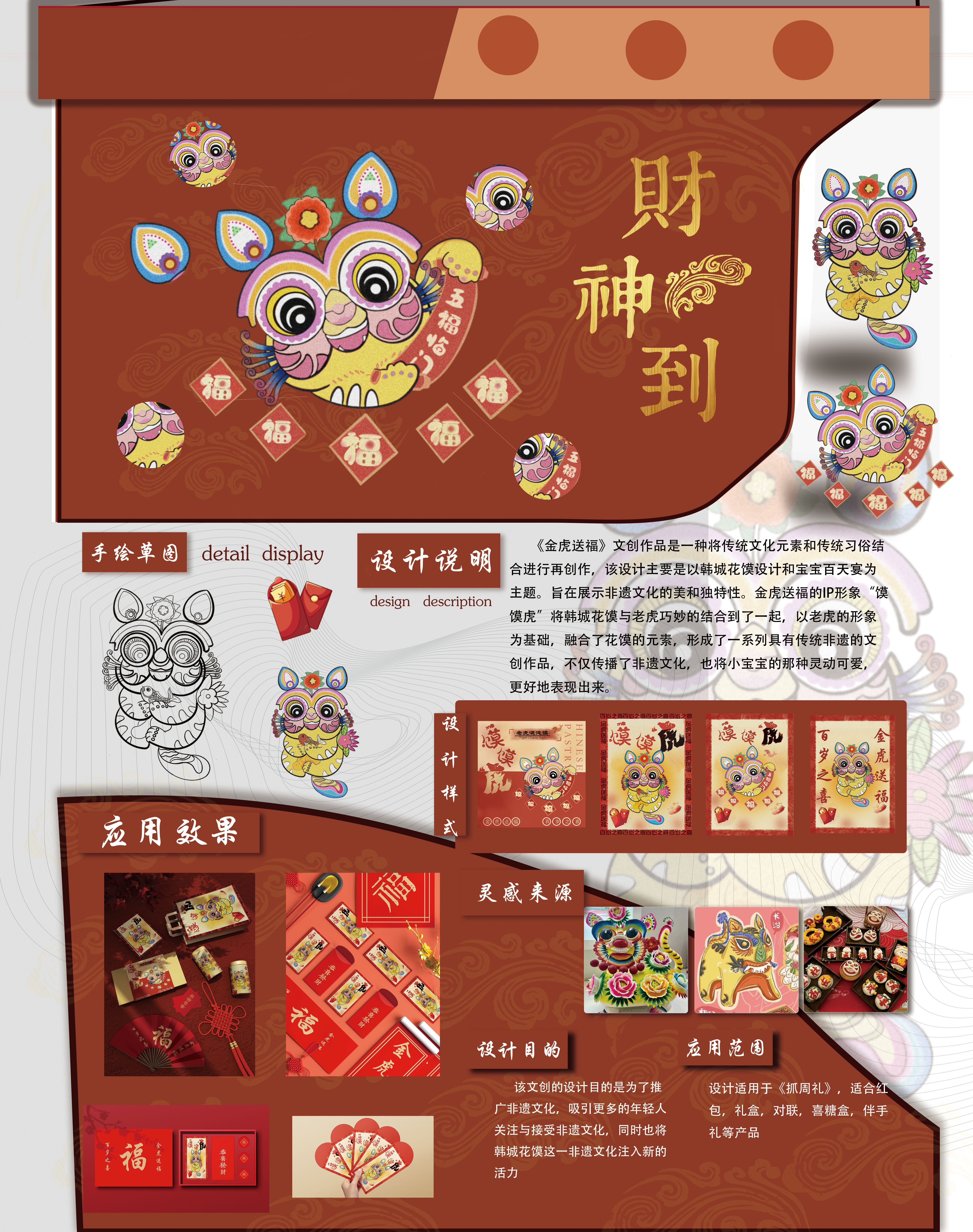 《金虎送福》文创作品是一种将传统文化元素和传统习俗结合进行再创作,该设计主要是以韩城花馍设计和宝宝百天宴为主题。旨在展示非遗文化的美和独特性。金虎送福的IP形象“馍馍虎”将韩城花馍与老虎巧妙的结合到了一起,以老虎的形象为基础,融合了花馍的元素,形成了一系列具有传统非遗的文创作品