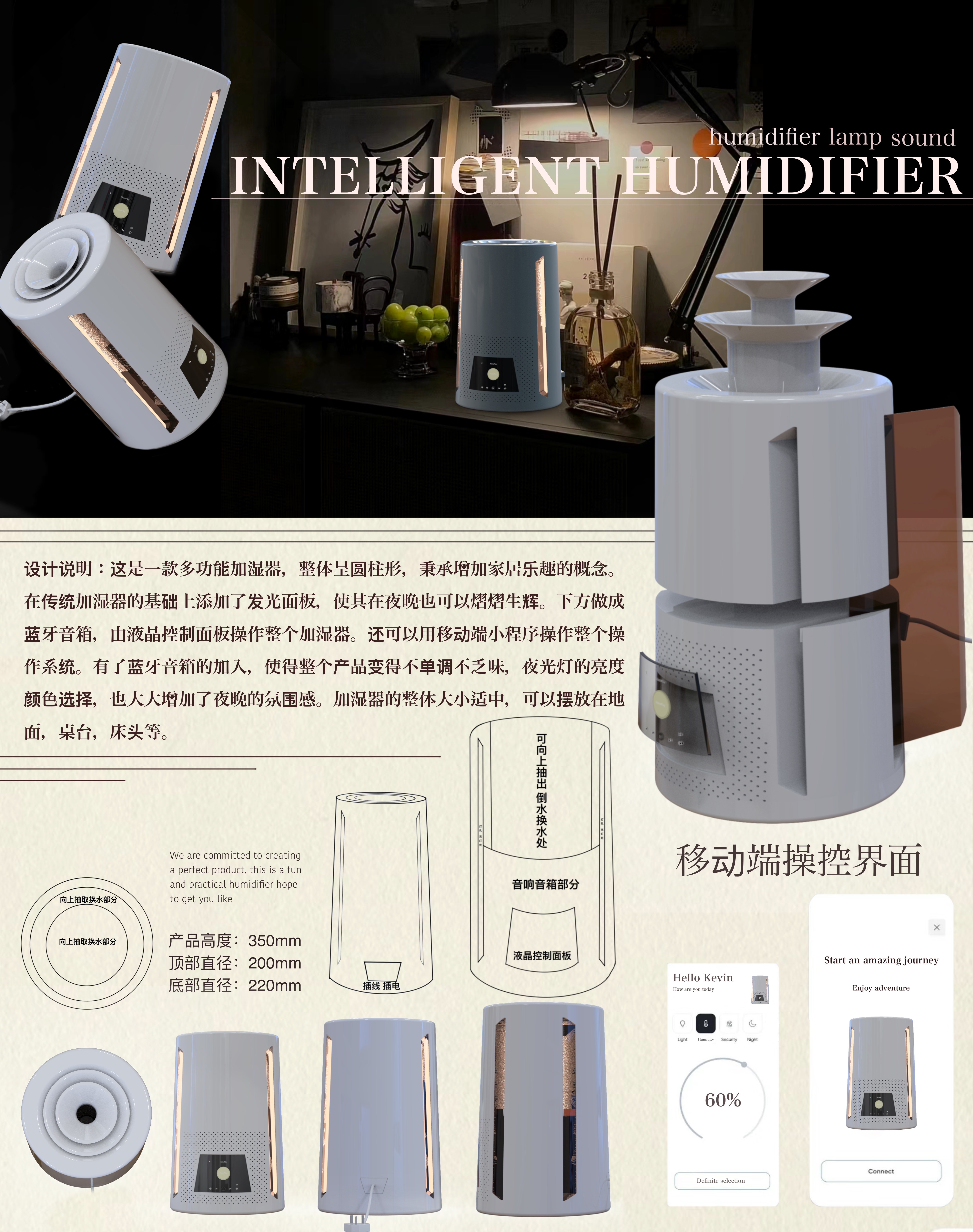 这是一款多功能加湿器,整体呈圆柱形,秉承增加家居乐趣的概念。在传统加湿器的基础上添加了发光面板,使其在夜晚也可以熠熠生辉。下方做成蓝牙音箱,由液晶控制面板操作整个加湿器。还可以用移动端小程序操作整个操作系统。有了蓝牙音箱的加入,使得整个产品变得不单调不乏味,夜光灯的亮度颜色选择,也大大增加了夜晚的氛围感。加湿器的整体大小适中,可以摆放在地面,桌台,床头等。