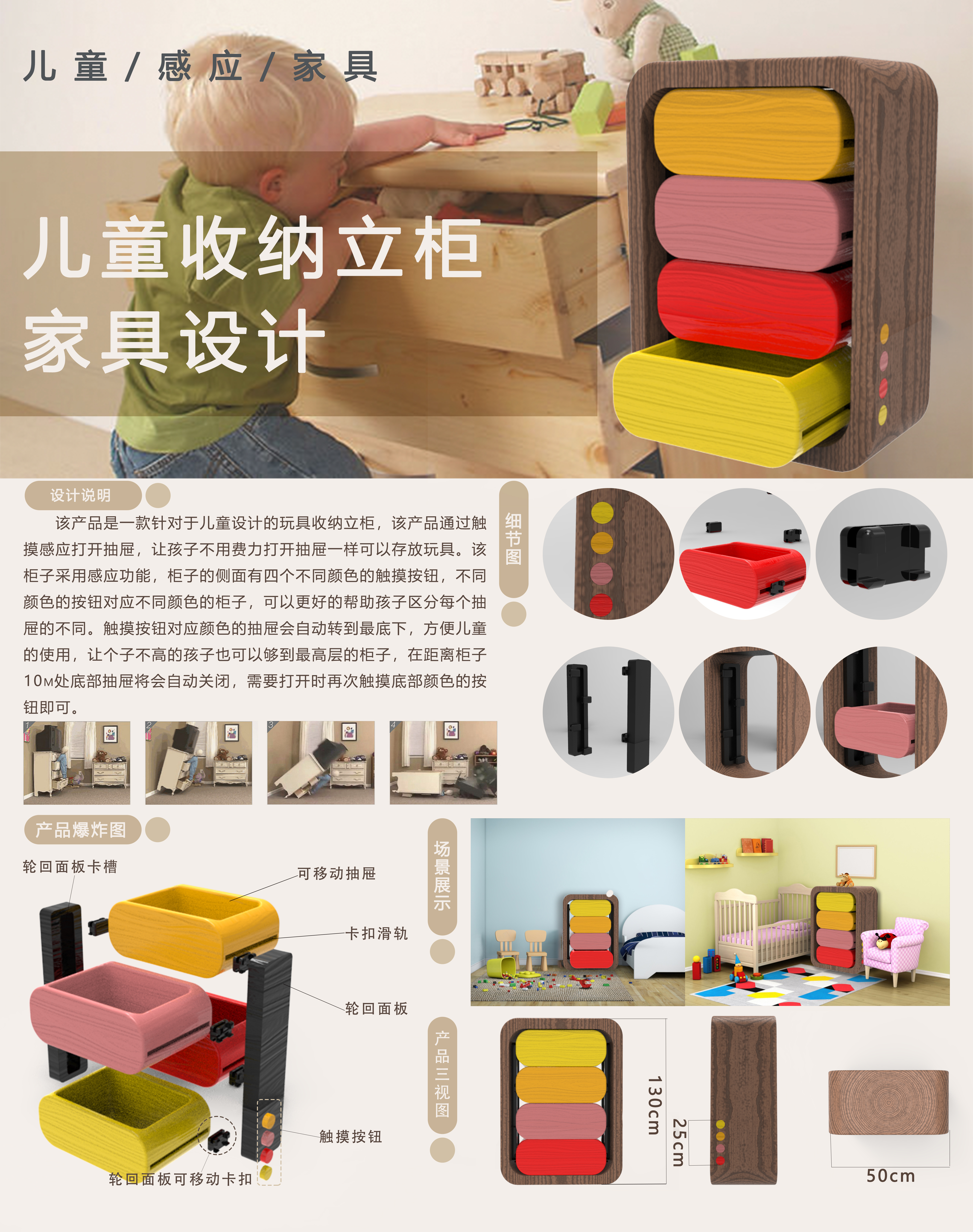 该产品是一款针对于儿童设计的玩具收纳立柜,该产品通过触摸感应打开抽屉让孩子不用费力一样可以存放玩具。该立柜采用感应功能,柜子的侧面有四个不同颜色的触摸按钮,不同颜色的按钮对应不同颜色的柜子,可以更好的帮助孩子区分每个抽屉的不同。触摸按钮对应颜色的抽屉会自动转到最底下,方便儿童的使用让个子不高的孩子也可以够到最高层的柜子,在距离柜子10m处底部抽屉将会自动关闭,需要打开时再次触摸底部颜色的按钮即可。
