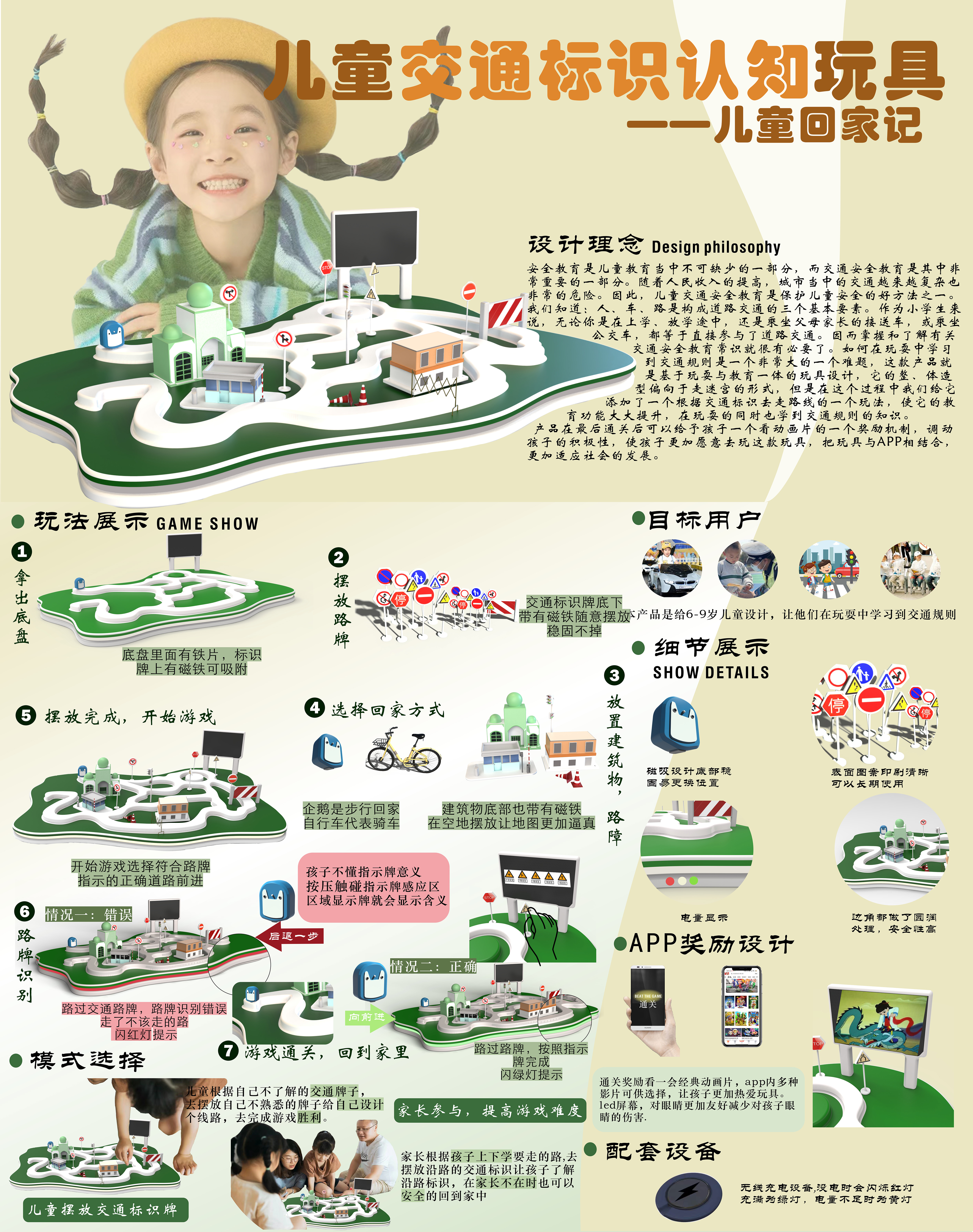 儿童交通安全教育是保护儿童安全的好方法之一。这款产品就是基于玩耍与教育一体的玩具设计,它的整、体造偏向于走迷宫的形式,但是在这个过程中我们给它添加了一个根据交通标识去走路线的一个玩法,使它的教育功能大大提升,在玩耍的同时也学到交通规则的知识。在最后通关后可以给予孩子一个看动画片的一个奖励机制,调动孩子的积极性,把玩具与APP相结合,更加适应社会的发展。