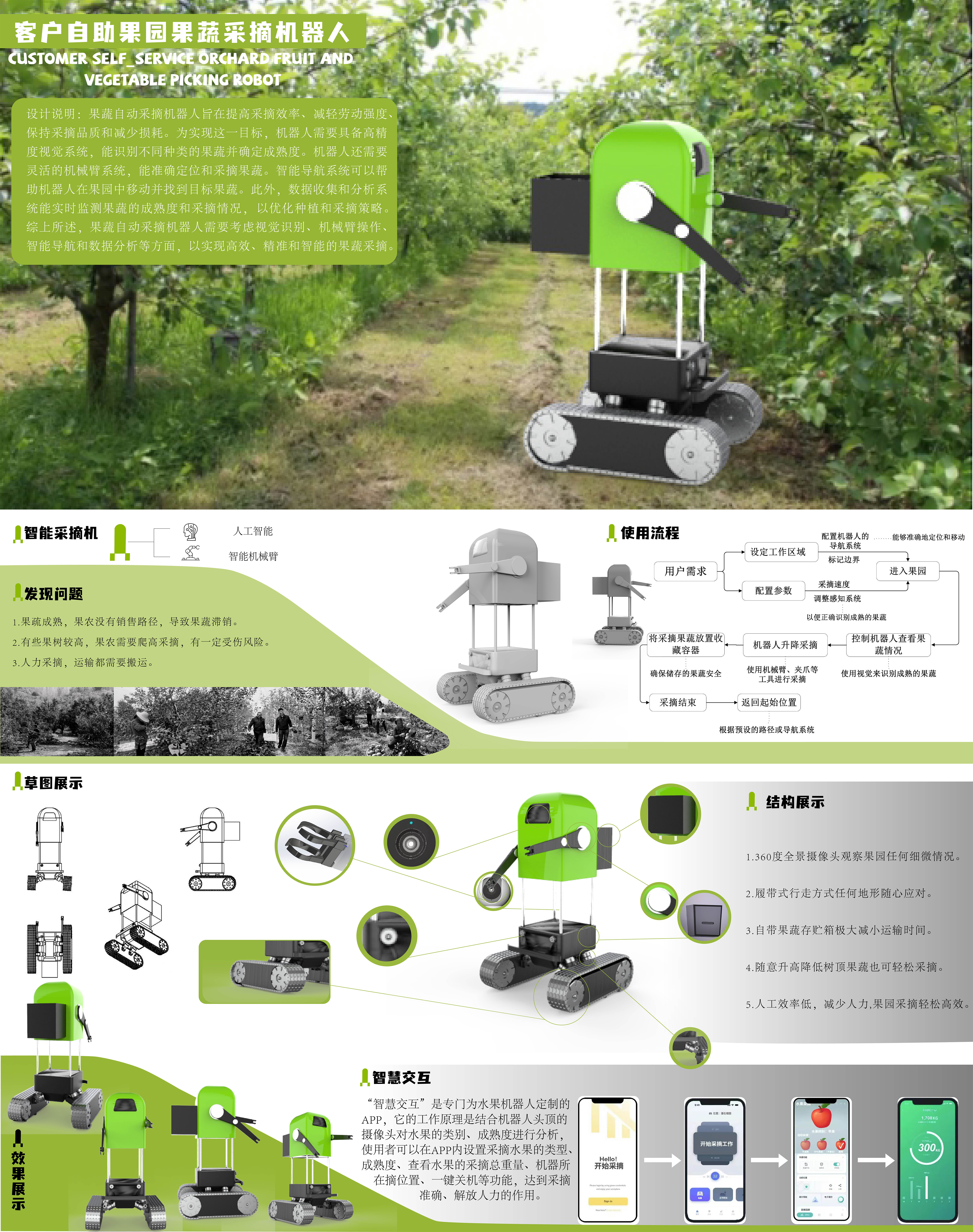 果蔬采摘机器人是一项创新的农业技术,旨在提高果蔬采摘的效率和减轻人工劳动。该机器人设计采用先进的视觉识别技术和机器学习算法,能够自动辨别成熟的苹果。其机械臂具备精确的定位和柔性的抓取能力。机器人还具备自主导航能力,选择最优的采摘路径。采摘机器人的设计目标是提高生产效率,减少采摘成本,减轻人工劳动,以及改善农业可持续性。这项技术有望在果农们的农业生产中发挥积极作用,有助于满足不断增长的食品需求。