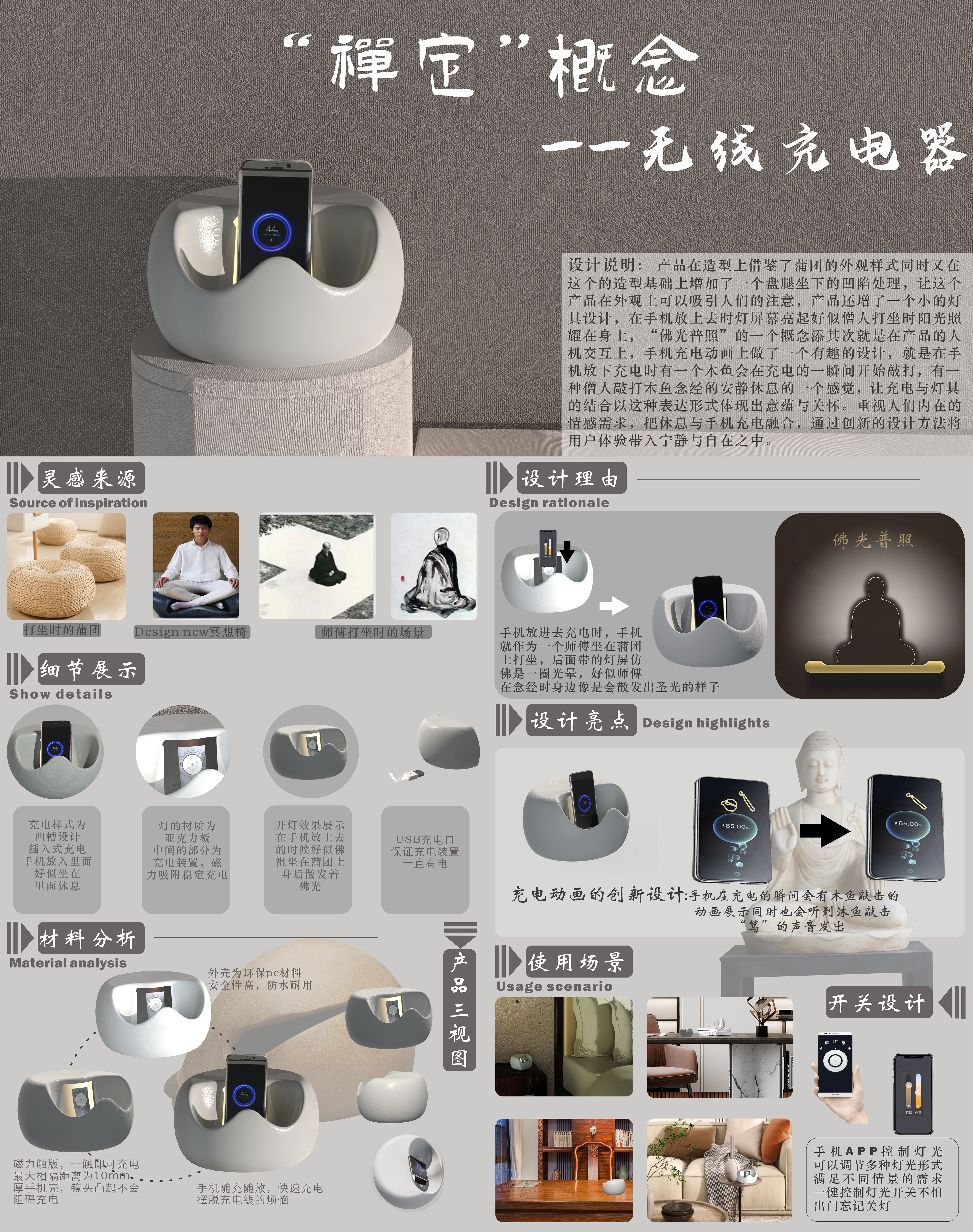 产品造型上借鉴了蒲团样式同时又在这个的造型增加了一个盘腿坐下的凹陷处理,在手机放上去时灯屏幕亮起好似僧人打坐时阳光照耀在身上,“佛光普照”的一个概念。在产品的人机交互上,充电动画上做了一个有趣的设计,就是在手机放下充电时有一个木鱼会在充电的一瞬间开始敲打,有一种僧人敲打木鱼念经的安静休息的一个感觉,重视人们内在的情感需求,把休息与手机充电融合,通过创新的设计方法将用户体验带入宁静与自在之中。