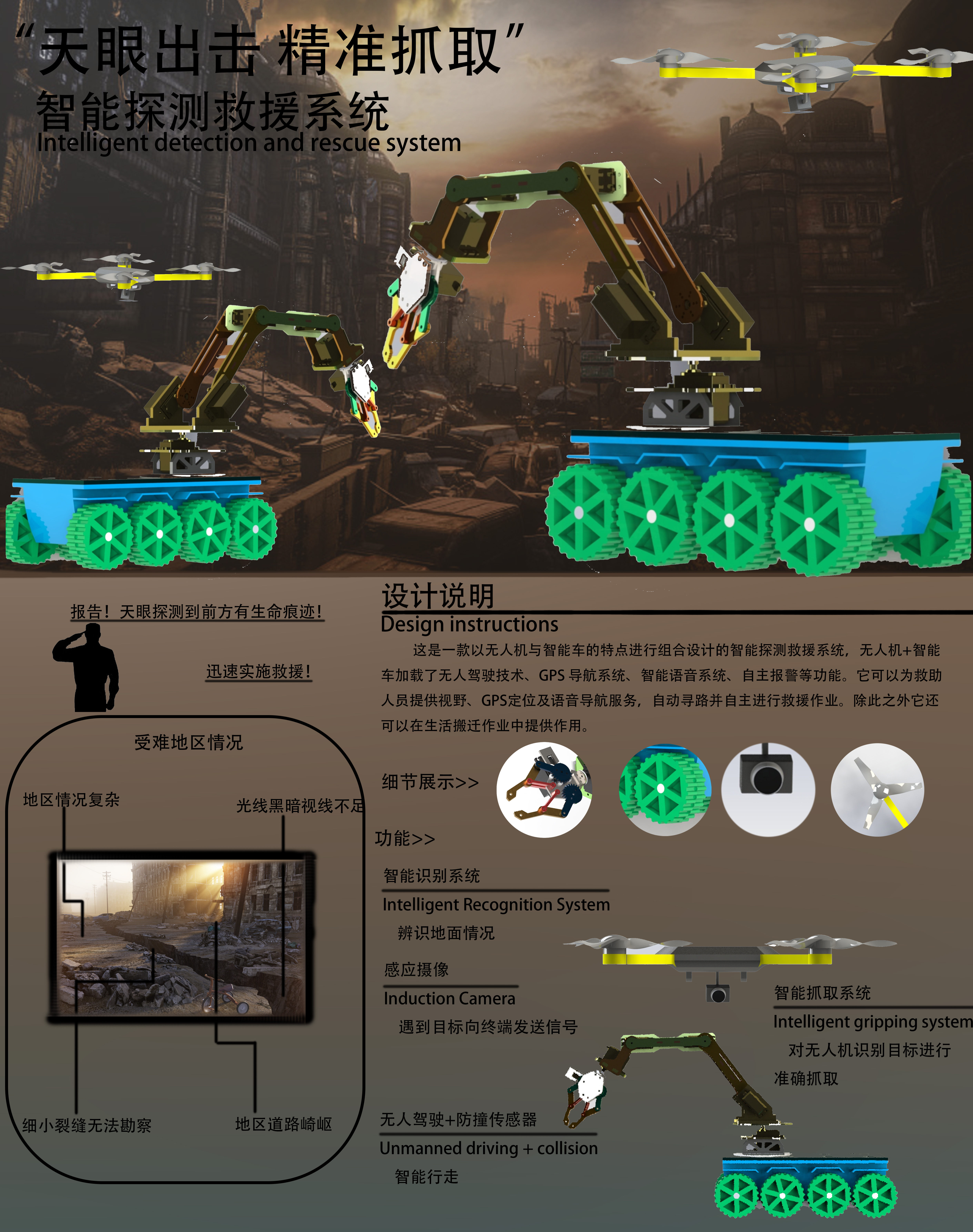 这是一款以无人机与智能车的特点进行组合设计的智能探测救援系统,无人机+智能车加载了无人驾驶技术、GPS 导航系统、智能语音系统、自主报警等功能。它可以为救助人员提供视野、GPS定位及语音导航服务,自动寻路并自主进行救援作业。除此之外它还可以在生活搬迁作业中提供作用。