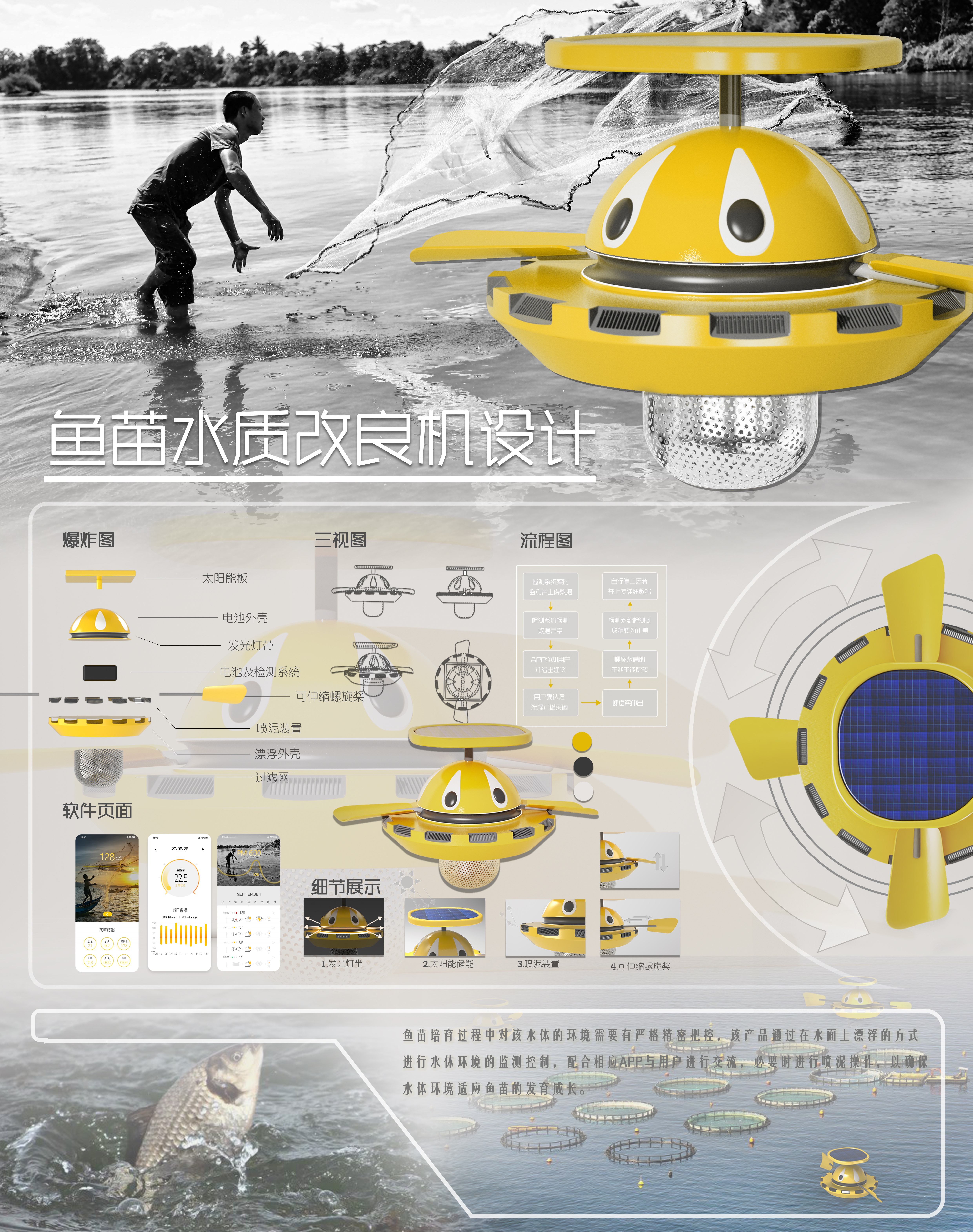 随着鱼苗养殖规模的扩大和密度的增加,对水环境和土壤环境等的消耗越来越大,以及在养殖过程中各类药物的使用,使得养殖水环境持续恶化。水质污染的问题已经严重影响到鱼苗养殖业。本产品针对于此现象,为鱼苗养殖地区设计一款水质改良仪。该产品通过在水面上漂浮的方式进行水体环境的监测控制,配合相应APP与用户进行交流,必要时进行喷泥操作,以确保水体环境适应鱼苗的发育成长。