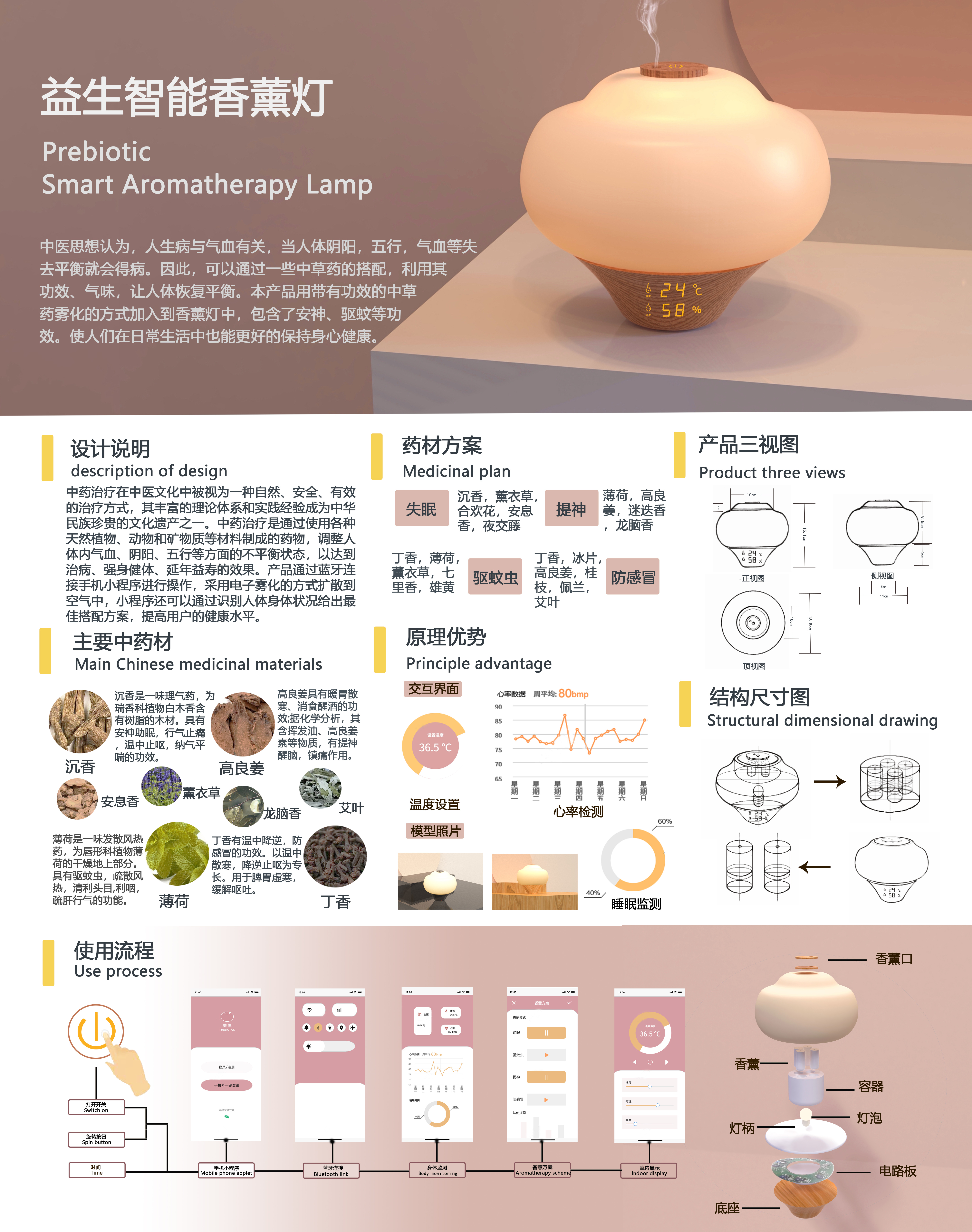 中医思想认为,人生病跟气血有关,当人体阴阳,五行,气血等失去平衡就会得病。因此,可以通过一些中草药的搭配,利用其功效、气味,让人体恢复平衡。因此本产品用带有功效的中草药制作精油的方式加入到香薰灯中,包含了安神、驱蚊等功效。使人们在日常生活中也能更好的保持身心健康。通过手机小程序进行操作,采用电子雾化的方式扩散到空气中,小程序还可以通过识别人体身体状况给出最佳搭配方案,提高用户的健康水平。