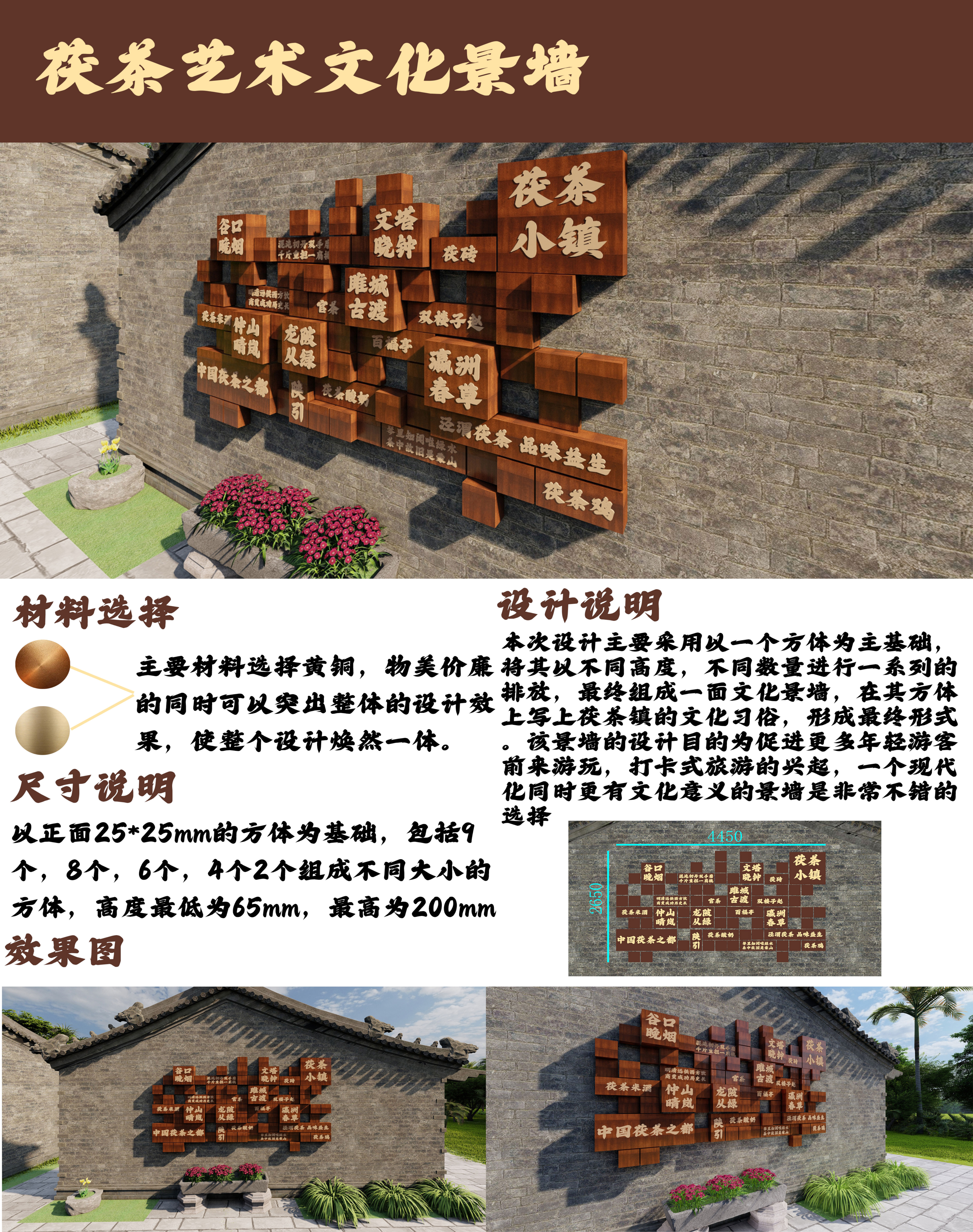 本次设计主要采用以一个方体为主基础,将其以不同高度,不同数量进行一系列的排放,最终组成一面文化景墙,在其方体上写上茯茶镇 的文化习俗,形成最终形式。该景墙的设计目的为促进更多年轻游客前来游玩,打卡式旅游的兴 起,一个现代化同时更有文化意义的景墙是非常不错的选择