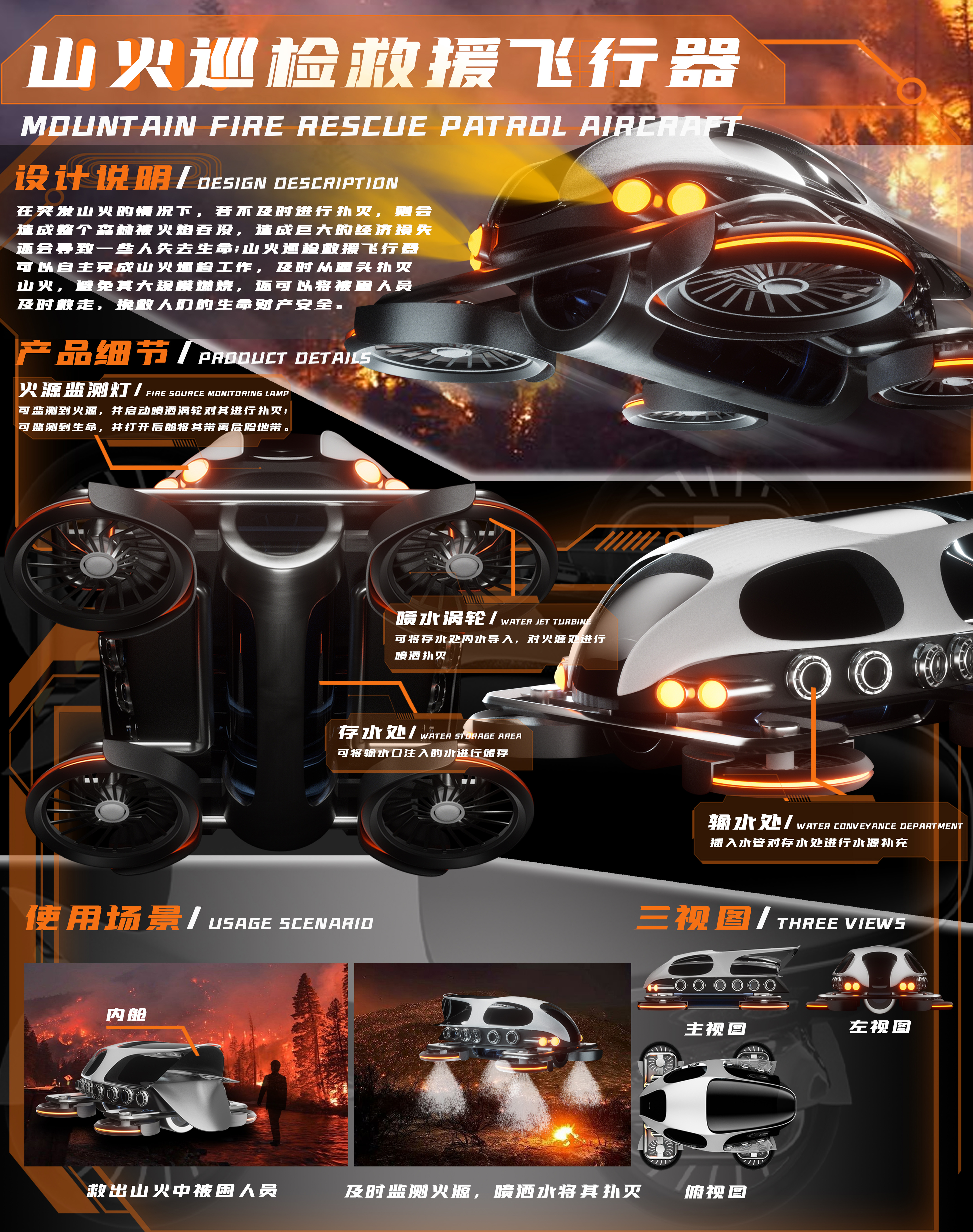 在突发森林山火的情况下,如若不及时进行扑灭,则会造成整个森林被火焰吞没,造成巨大的经济损失,还会导致一些人因此失去生命。为此,我设计了这款山火巡检救援飞行器,它可以自主完成山火巡检工作,及时监测到火源并将其扑灭,避免其大规模地燃烧,还可以及时将被困人员救走,挽救人们的生命财产安全。