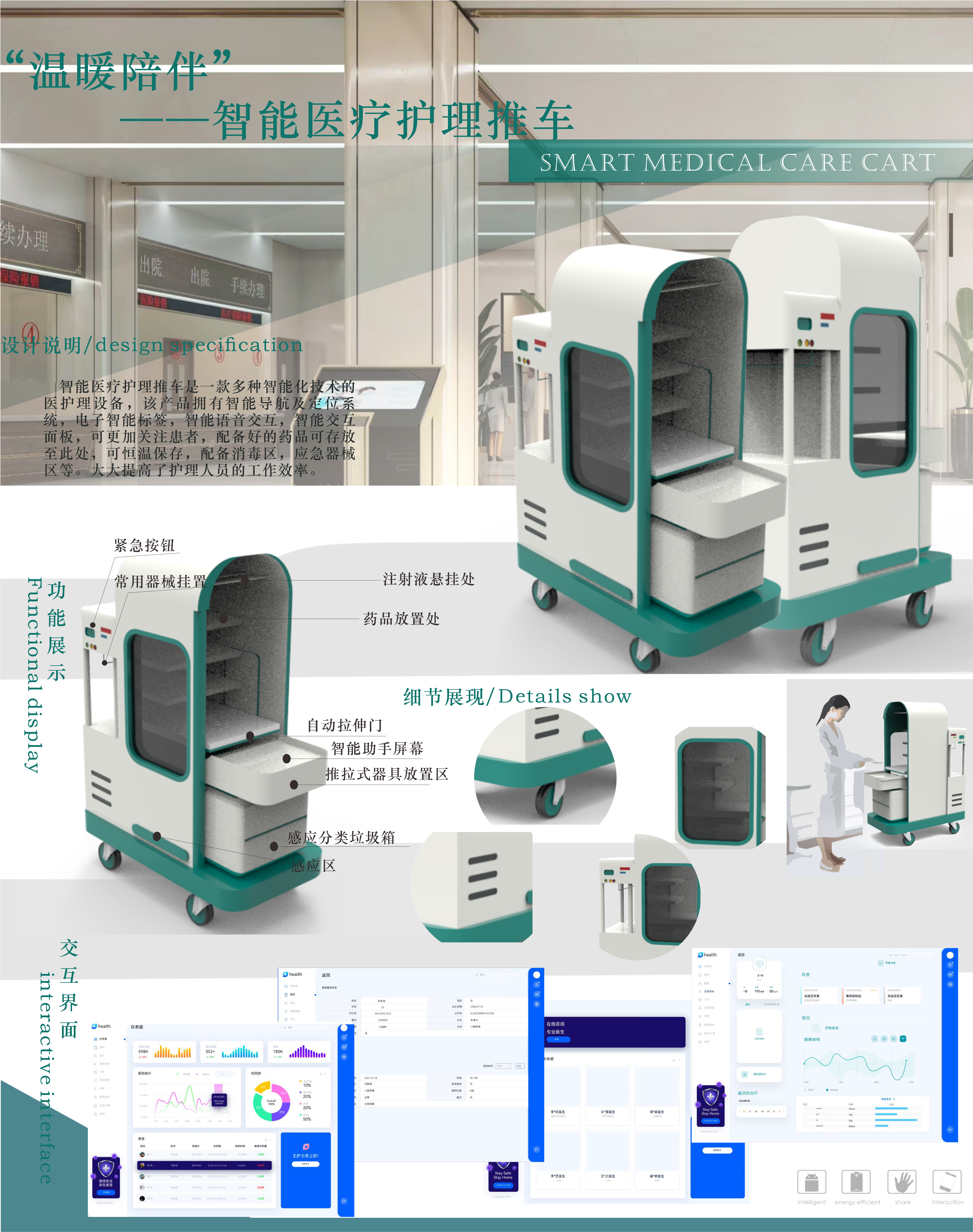智能医疗护理推车是一款多种智能化技术的医护理设备,该产品拥有智能导航及定位系统,电子智能标签,智能语音交互,智能交互面板,可更加关注患者,配备好的药品可存放至此处,可恒温保存,配备消毒区,应急器械区等。大大提高了护理人员的工作效率。