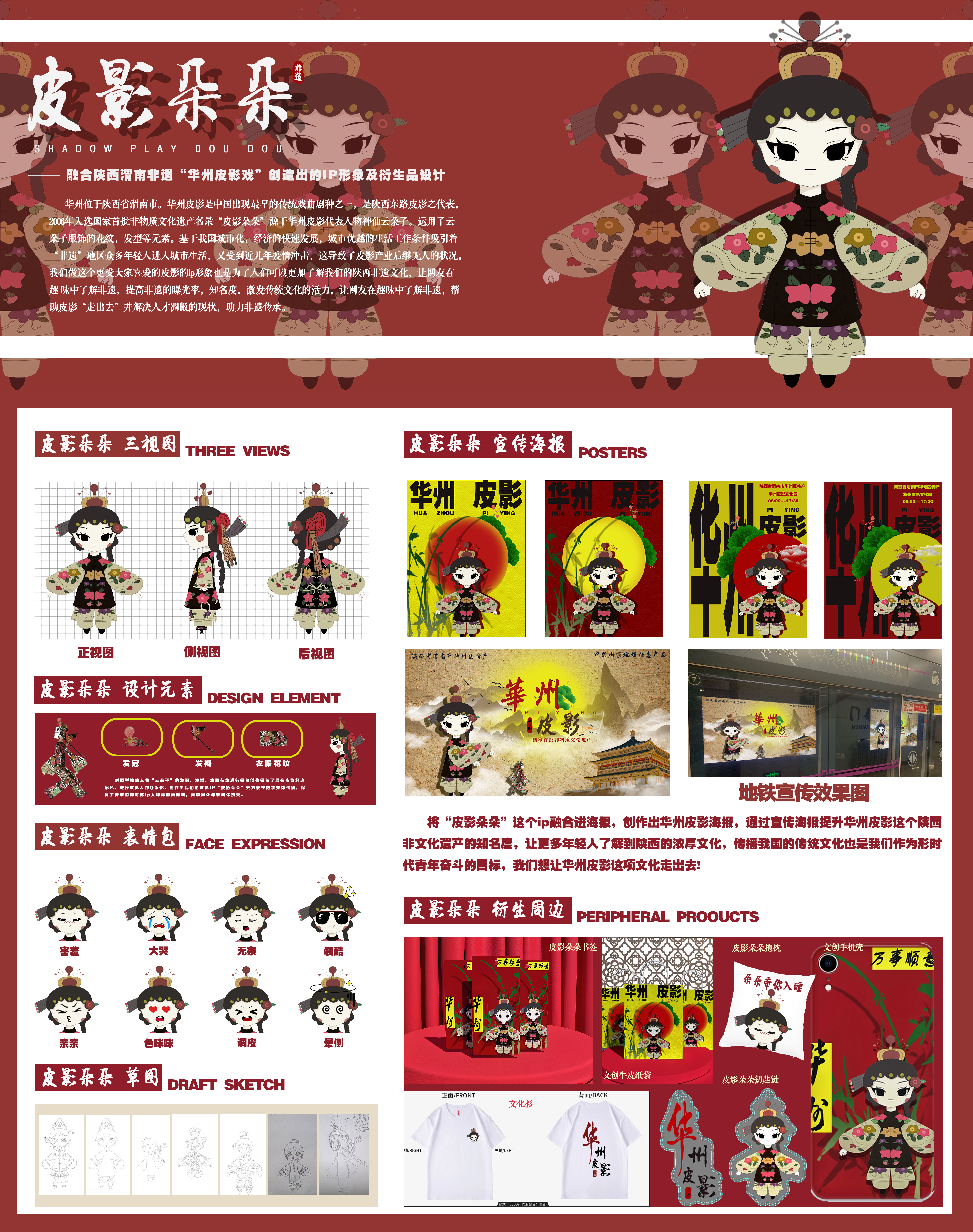 华州皮影是中国出现最早的传统戏曲剧种之一,2006年入选国家首批非物质文化遗产名录。“皮影朵朵”源于华州皮影代表人物神仙云朵子。运用了其服饰的花纹,发型等元素。基于我国经济的快速发展,城市优越的生活工作条件吸引着“非遗”地区众多年轻人进入城市生活,导致了皮影产业后继无人的状况。我们做这个更受大家喜爱的ip形象也是为了让网友在趣 味中了解非遗,提高非遗的知名度。帮助皮影“走出去”助力非遗传承。
