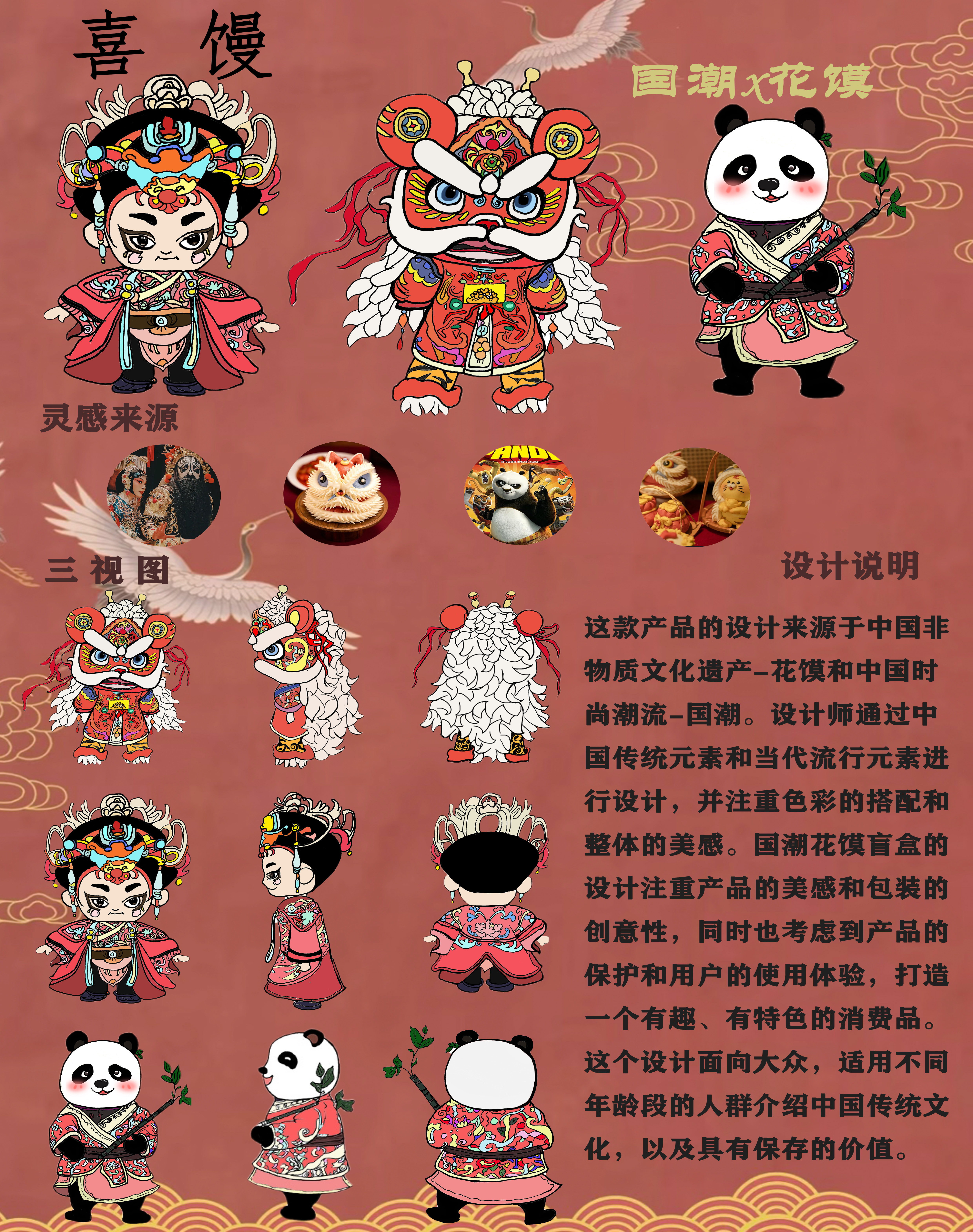 这款产品的设计来源于中国非物质文化遗产-花馍和中国时尚潮流-国潮。设计师通过中国传统元素和当代流行元素进行设计,并注重色彩的搭配和整体的美感。国潮花馍盲盒的设计注重产品的美感和包装的创意性,同时也考虑到产品的保护和用户的使用体验,打造一个有趣、有特色的消费品。这个设计面向大众,可以像不同年龄段的人群介绍中国传统文化,以及具有保存的价值。