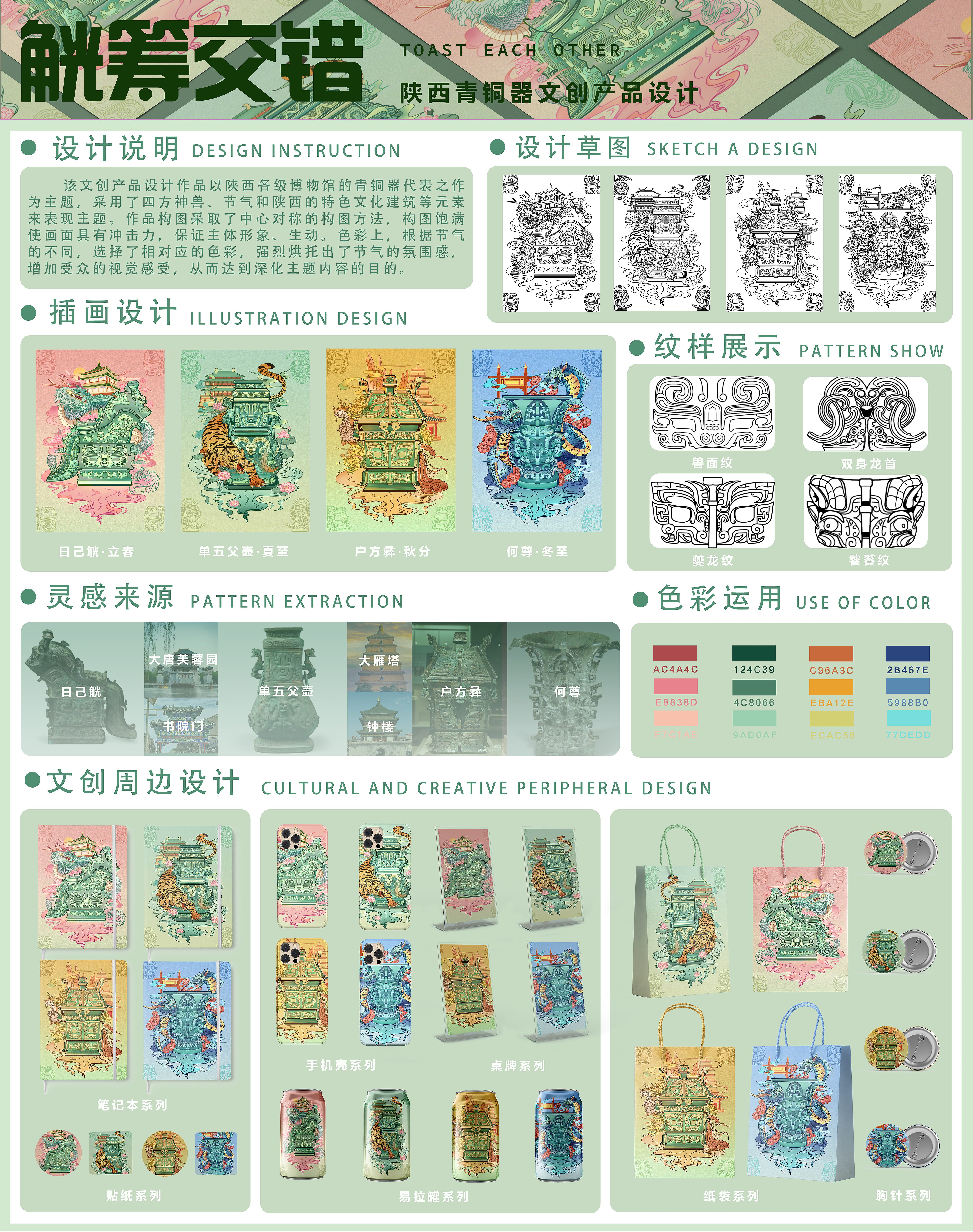 该文创产品设计作品以陕西各级博物馆的青铜器代表之作为主题,采用了四方神兽、节气和陕西的特色文化建筑等元素来表现主题。作品构图采取了中心对称的构图方法,构图饱满使画面具有冲击力,保证主体形象、生动。色彩上,根据节气的不同,选择了相对应的色彩,强烈烘托出了节气的氛围感,增加受众的视觉感受,从而达到深化主题内容的目的。