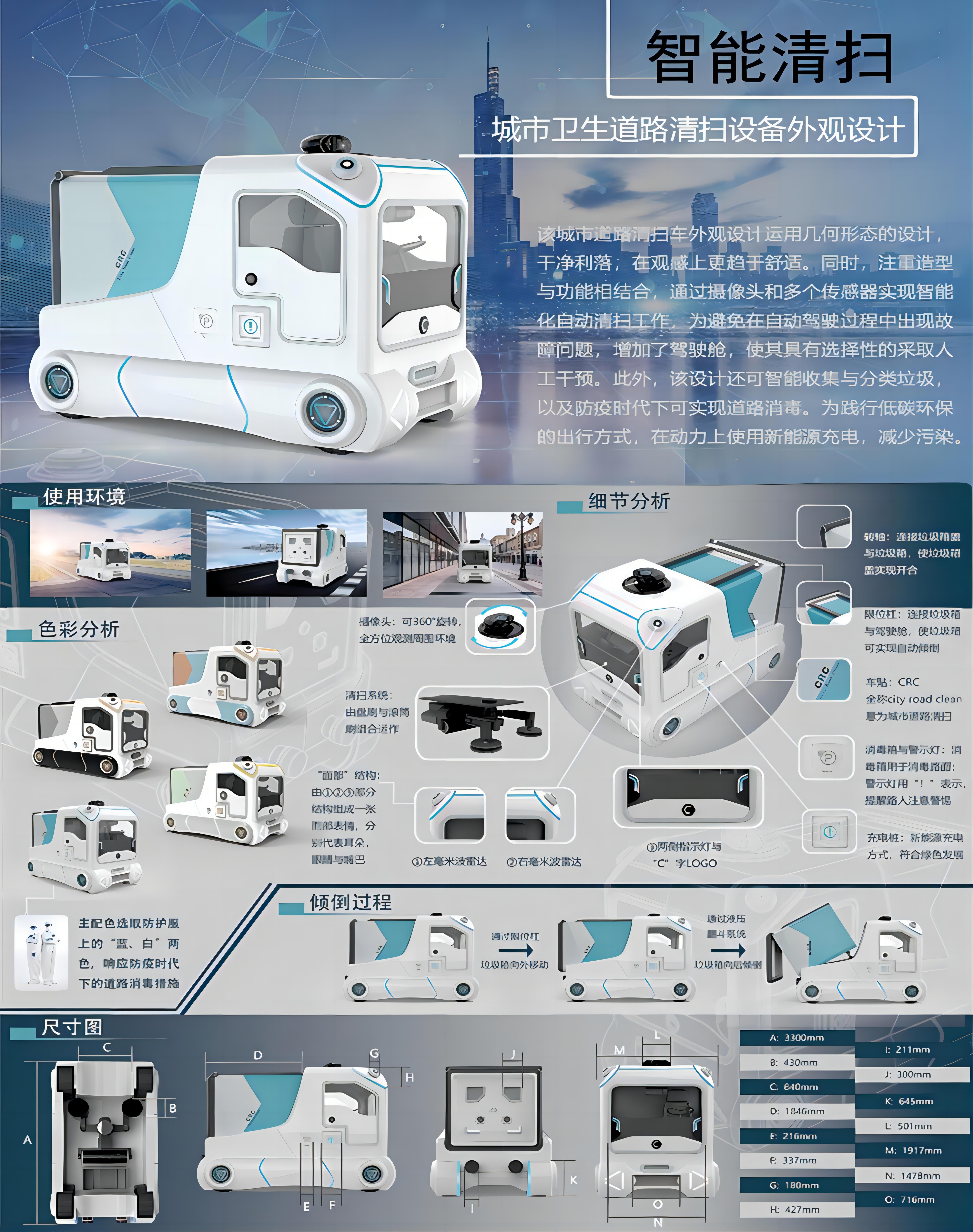 该城市道路清扫车外观设计运用几何形态的设计,干净利落,在观感上更趋于舒适。同时,注重造型与功能相结合,通过摄像头和多个传感器实现智能化自动清扫工作,为避免在自动驾驶过程中出现故 障问题,增加了驾驶舱,使其具有选择性的采取人工干预。此外,该设计还可智能收集与分类垃圾以及防疫时代下可实现道路消毒。为践行低碳环保的出行方式,在动力上使用新能源充电,减少污染。