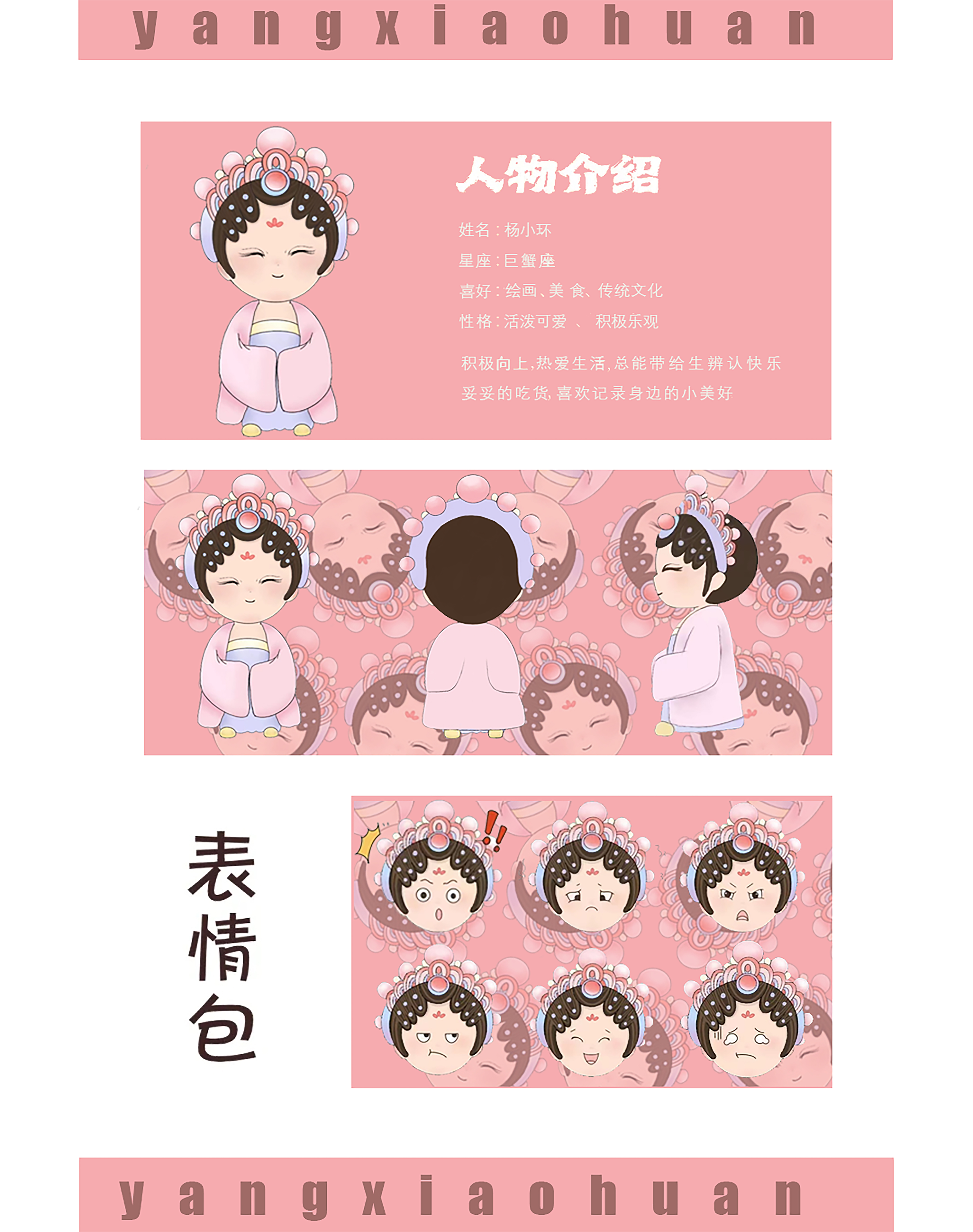 该IP形象设计以杨玉环为原型,采用圆润的人物设计,呈现出温柔、可爱的形象。配色方面,选择了粉色作为主色调,粉色代表温柔、浪漫和甜美,与杨玉环的形象相得益彰,能够吸引用户的注意力并营造愉悦的氛围。表情包设计方面,设计了一系列生动、有趣的表情包,包括笑脸、惊讶、调皮等多种表情,以及与粉色配色相呼应的背景色。整体设计风格以简洁、可爱、活泼为主,旨在为用户带来愉悦的视觉体验和丰富的情感表达方式。