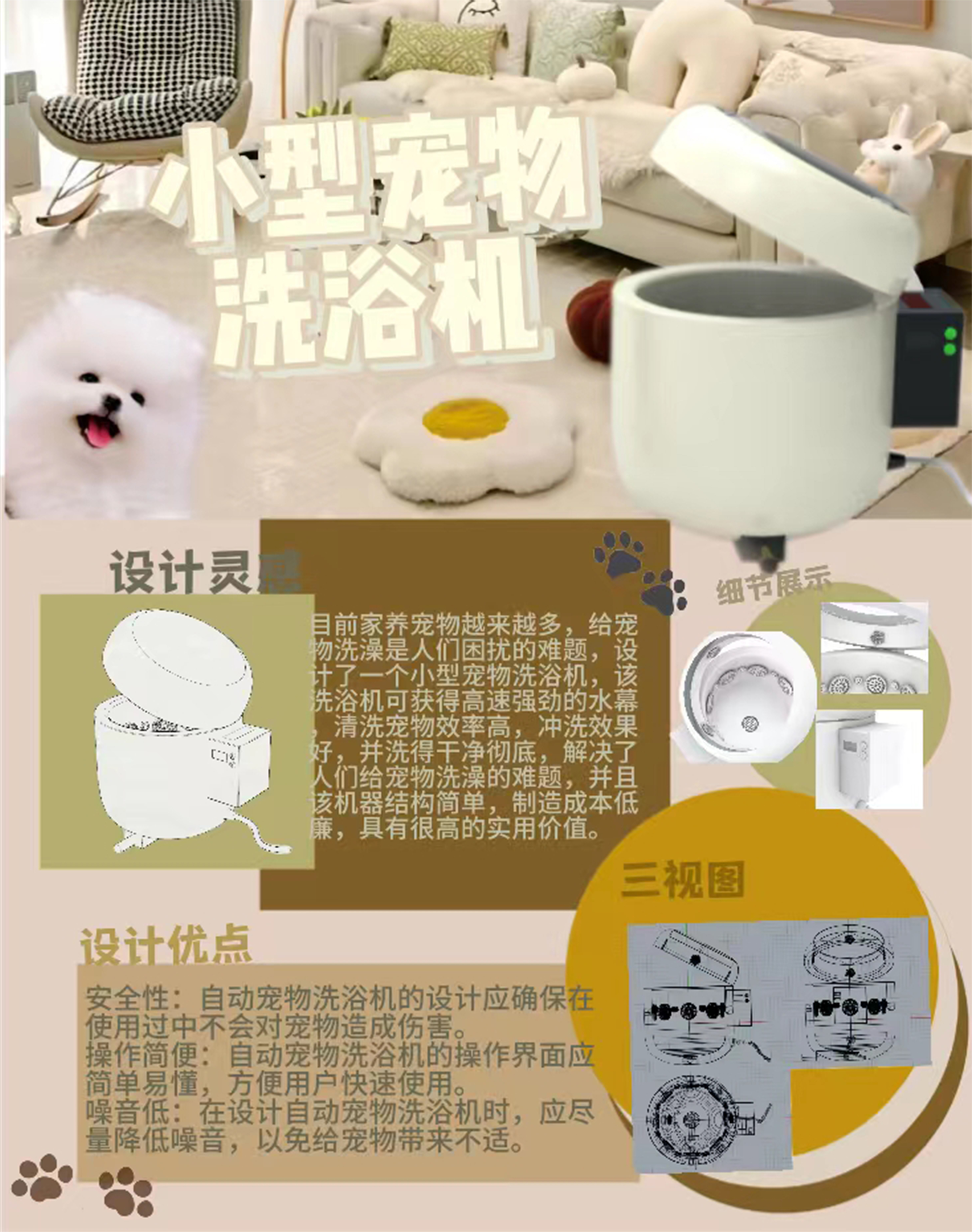 目前家养宠物越来越多,给宠物洗澡是人们困扰的难题,设计了一个小型宠物洗浴机,该洗浴机可获得高速强劲的水幕,清洗宠物效率高,冲洗效果好,并洗得干净彻底,解决了人们给宠物洗澡的难题,并且该机器结构简单,制造成本低廉,具有很高的实用价值。