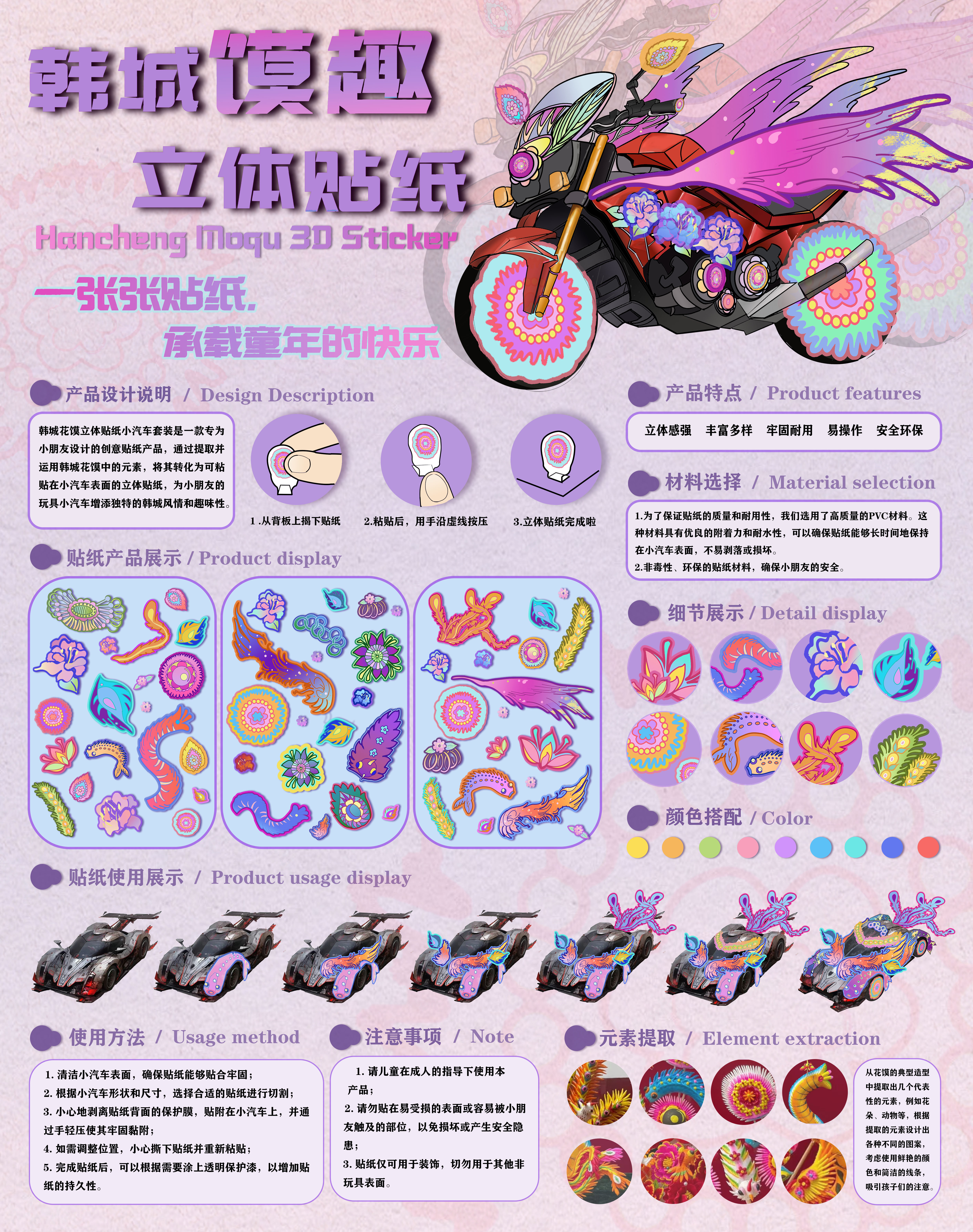 韩城馍趣立体贴纸小汽车套装是一款专为小朋友设计的创意贴纸产品,产品通过提取和运用韩城花馍中的元素,将其转化为可粘贴在小汽车表面的立体贴纸;并以饱和度较高的颜色进行设计,吸引小朋友的注意力;立体感的设计,通过多层次的构造,增加贴纸的逼真感为小朋友的玩具小汽车增添独特的韩城花馍风情和趣味。