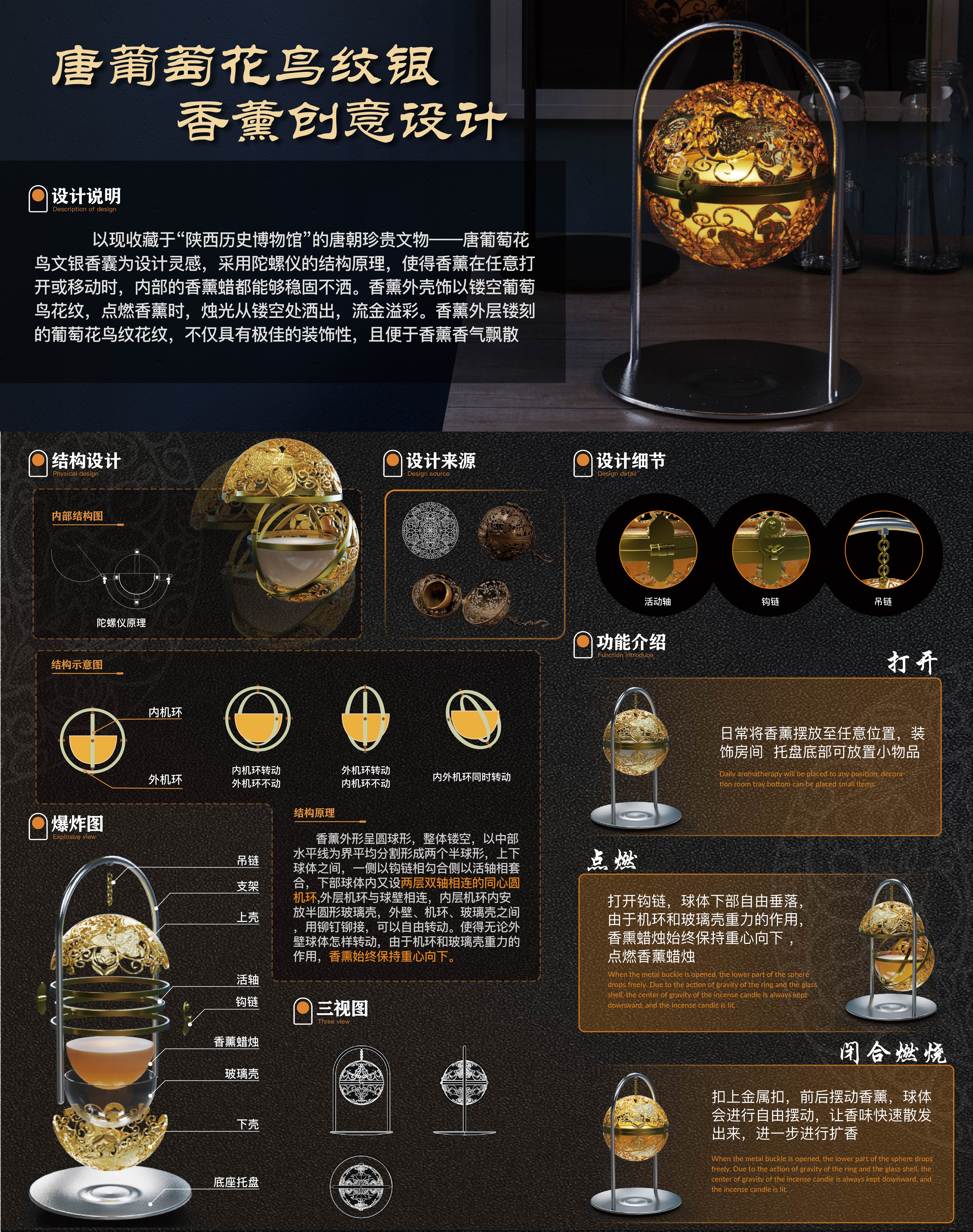 以现收藏于“陕西历史博物馆”的唐朝珍贵文物——唐葡萄花鸟文银香囊为设计灵感,采用陀螺仪的结构原理,使得香薰在任意打开或移动时,内部的香薰蜡都能够稳固不洒。香薰外壳饰以镂空葡萄鸟花纹,点燃香薰时,烛光从镂空处洒出,流金溢彩。香薰外层镂刻的葡萄花鸟纹花纹,不仅具有极佳的装饰性,且便于香薰香气飘散。