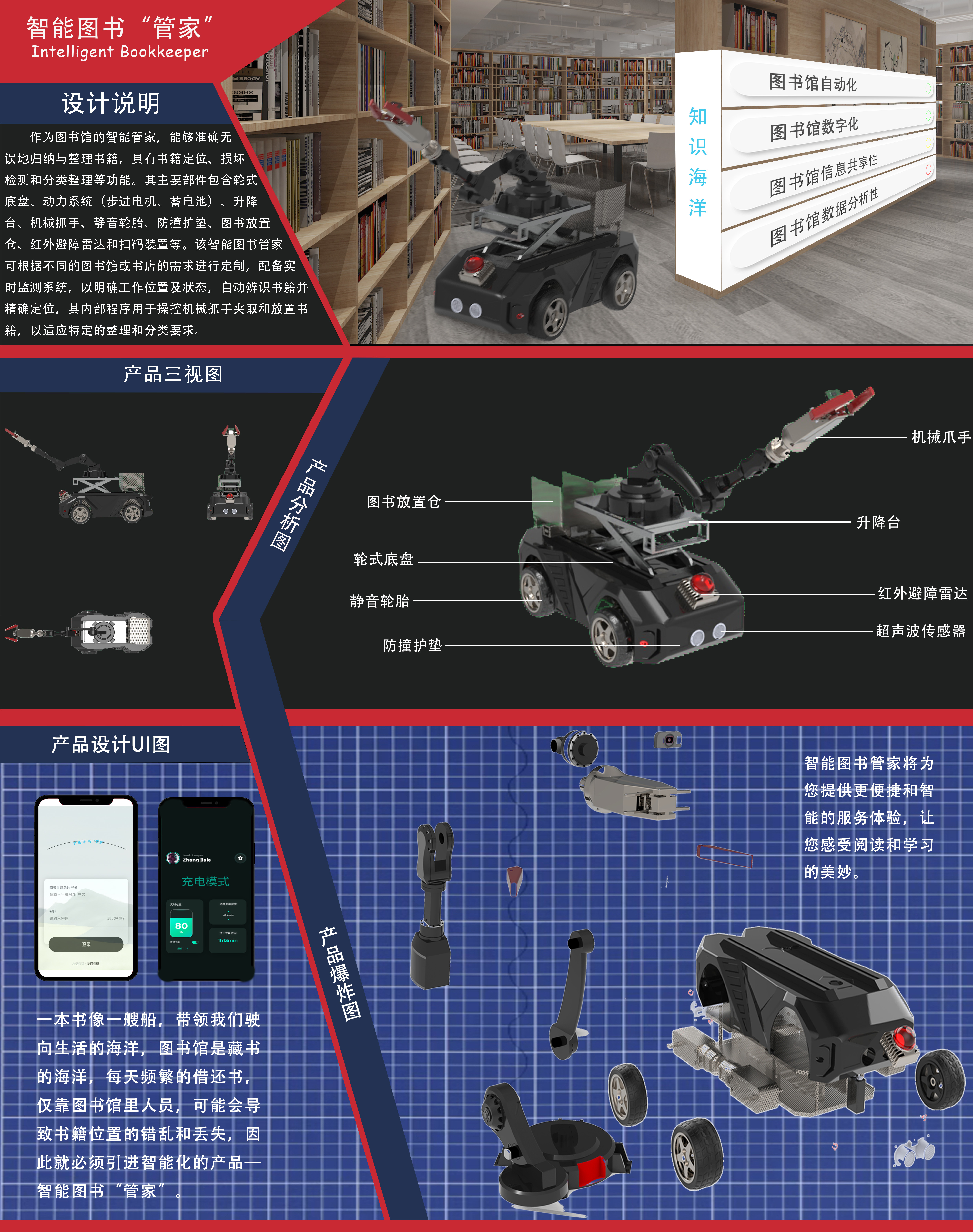 图书智能管家能够准确无误地归纳与整理书籍,具有书籍定位、损坏检测和分类整理等功能。其主要部件包含轮式底盘、动力系统(步进电机、蓄电池)、升降台、机械抓手、静音轮胎、防撞护垫、图书放置仓、红外避障雷达和扫码装置等。该智能图书管家可根据不同的图书馆或书店的需求进行定制,配备实时监测系统,以明确工作位置及状态,自动辨识书籍并精确定位,其内部程序用于操控机械抓手夹取和放置书籍,以适应特定的整理和分类要求。