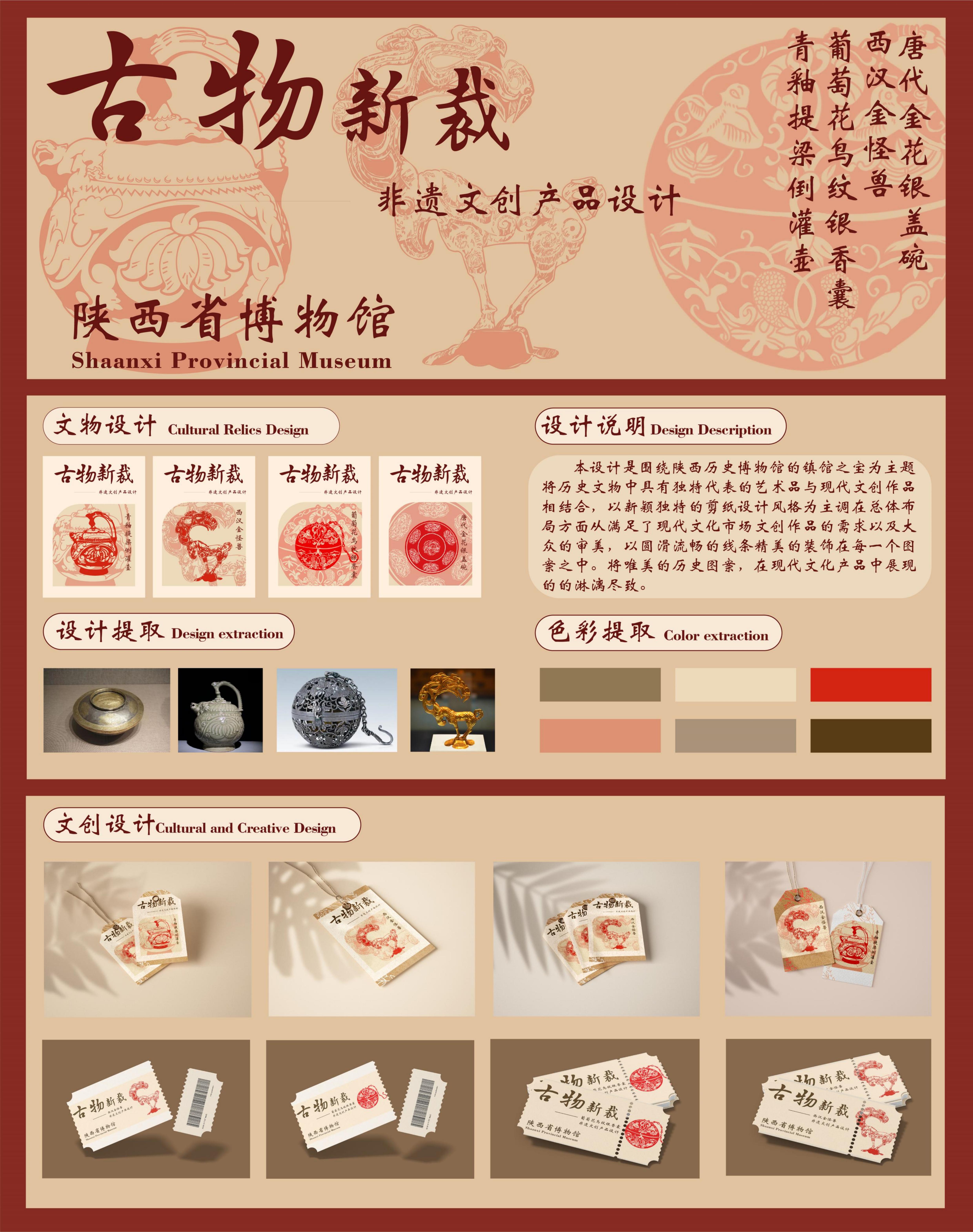 本次设计是围绕陕西历史博物馆的镇馆之宝为主题,将历史文物中具有独特代表的艺术品与现代文创作品相结合,以新颖独特的剪纸设计风格为主调,在总体布局方面满足了现代文化市场文创作品的需求以及大众的审美,以圆滑流畅的线条精美的装饰在每一个图案之中。所做的各种图形,可以分别运用在书签、邮票之中。将唯美的历史图案,在现代文化产品中展现的的淋漓尽致。