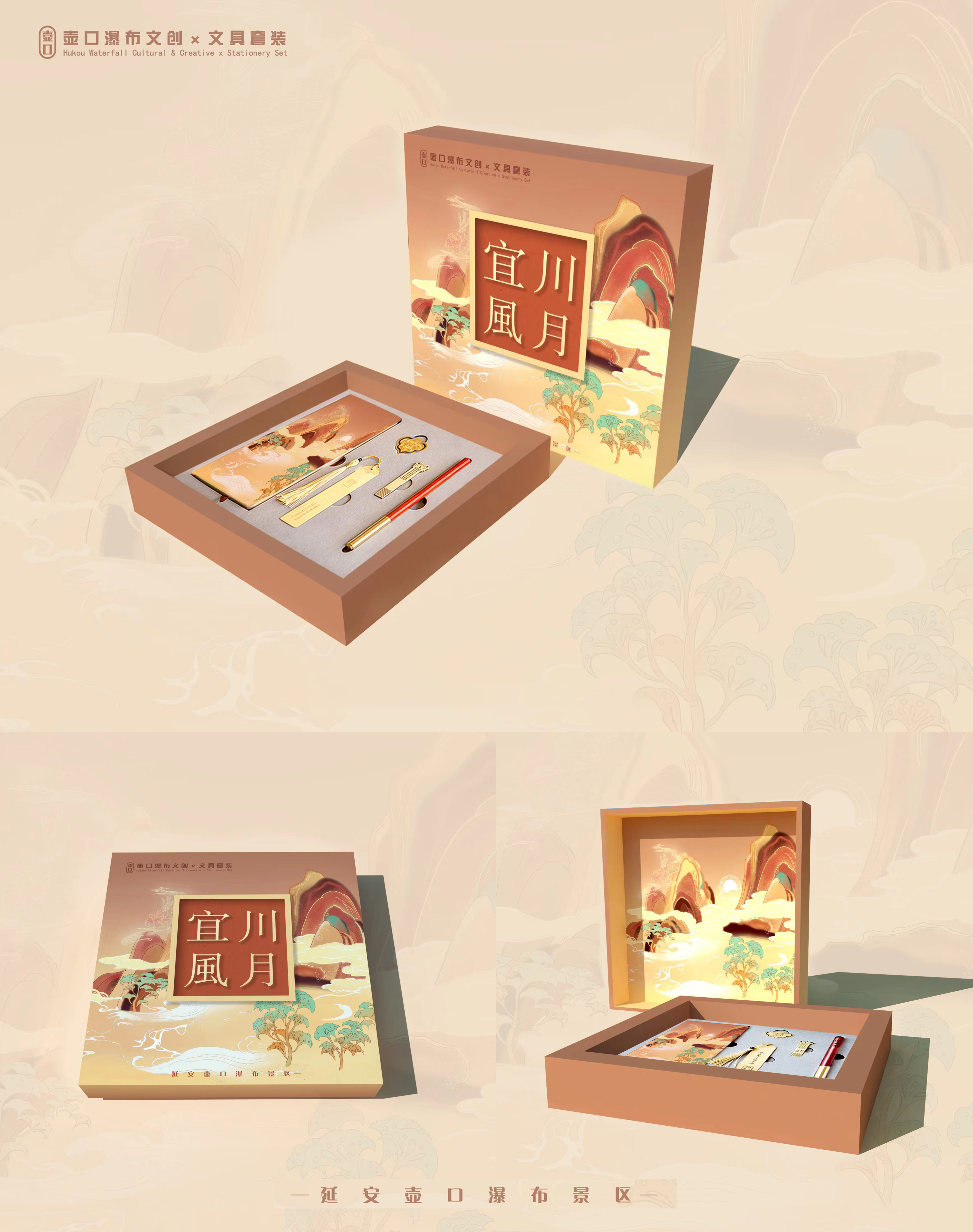 以壶口瀑布景区《宜川风月》为名,设计一款文具套装,将自然之美和人文韵味融入产品,旨在展示壶口瀑布美景和宜川文化,激发人们对自然和人文的热爱与关注。 通过精致的设计和精选的材质,营造出独特的文化氛围。该文具套装包含笔记本、钢笔等。精美的封面设计和包装,展现壶口瀑布景区的独特之美,吸引消费者的眼球。宜川壶口瀑布作为笔记本套装的主题,通过多种文化元素的融合,形成独具个性化的设计。