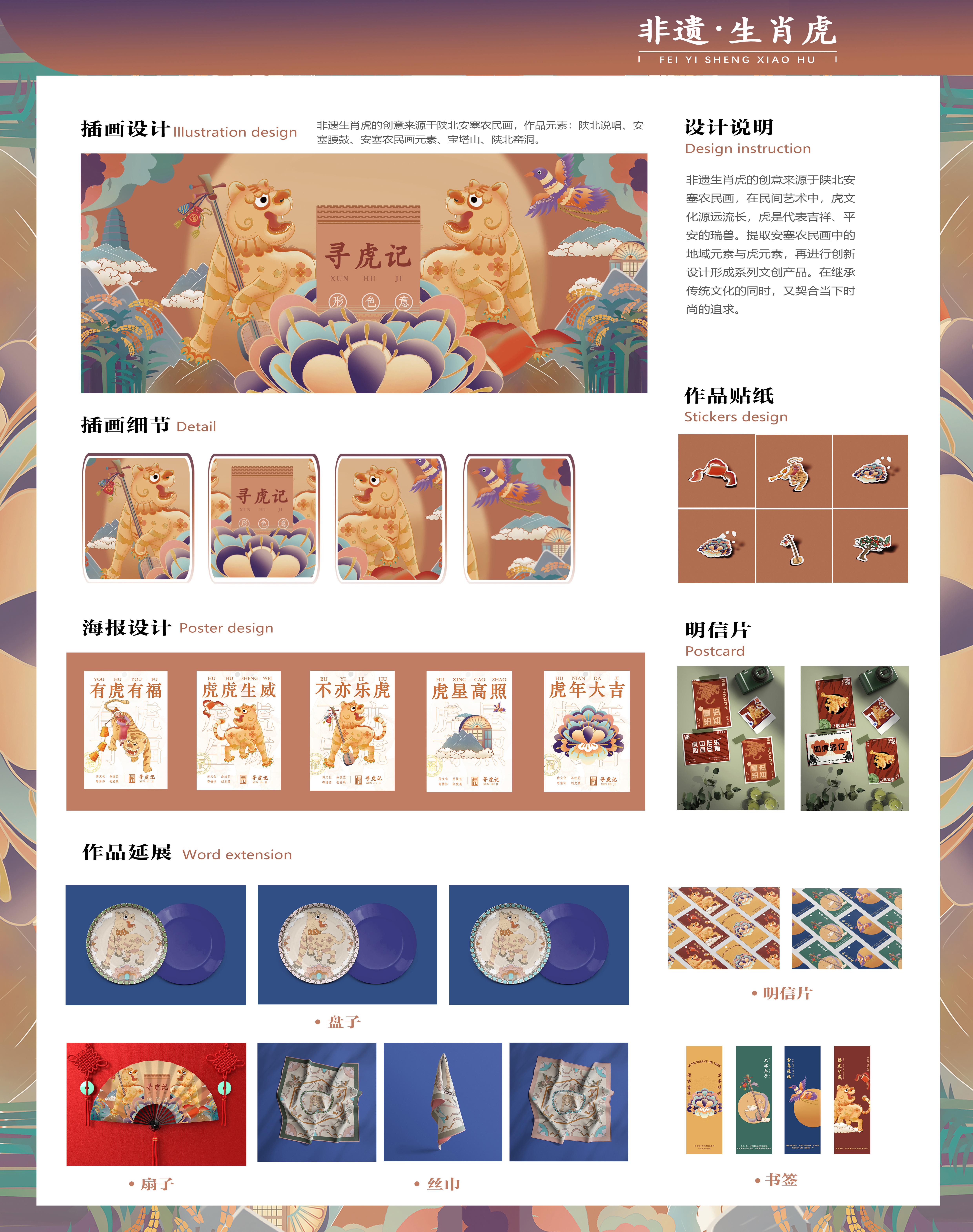 进化协同共生,文化是多元的,文化进步是通过人类文化的吸收和继承实现的,因此,继承非遗传统文化是极为重要的。非遗生肖虎的创意来源于陕北安塞农民画,在民间艺术中,虎文化源远流长,虎是代表吉祥、平安的瑞兽。提取安塞农民画中的地域元素与虎元素,包括陕北说唱、安塞腰鼓、安塞农民画元素、宝塔山、陕北窑洞等,再进行创新设计形成系列文创产品。在继承传统文化的同时,又契合当下时尚的追求。