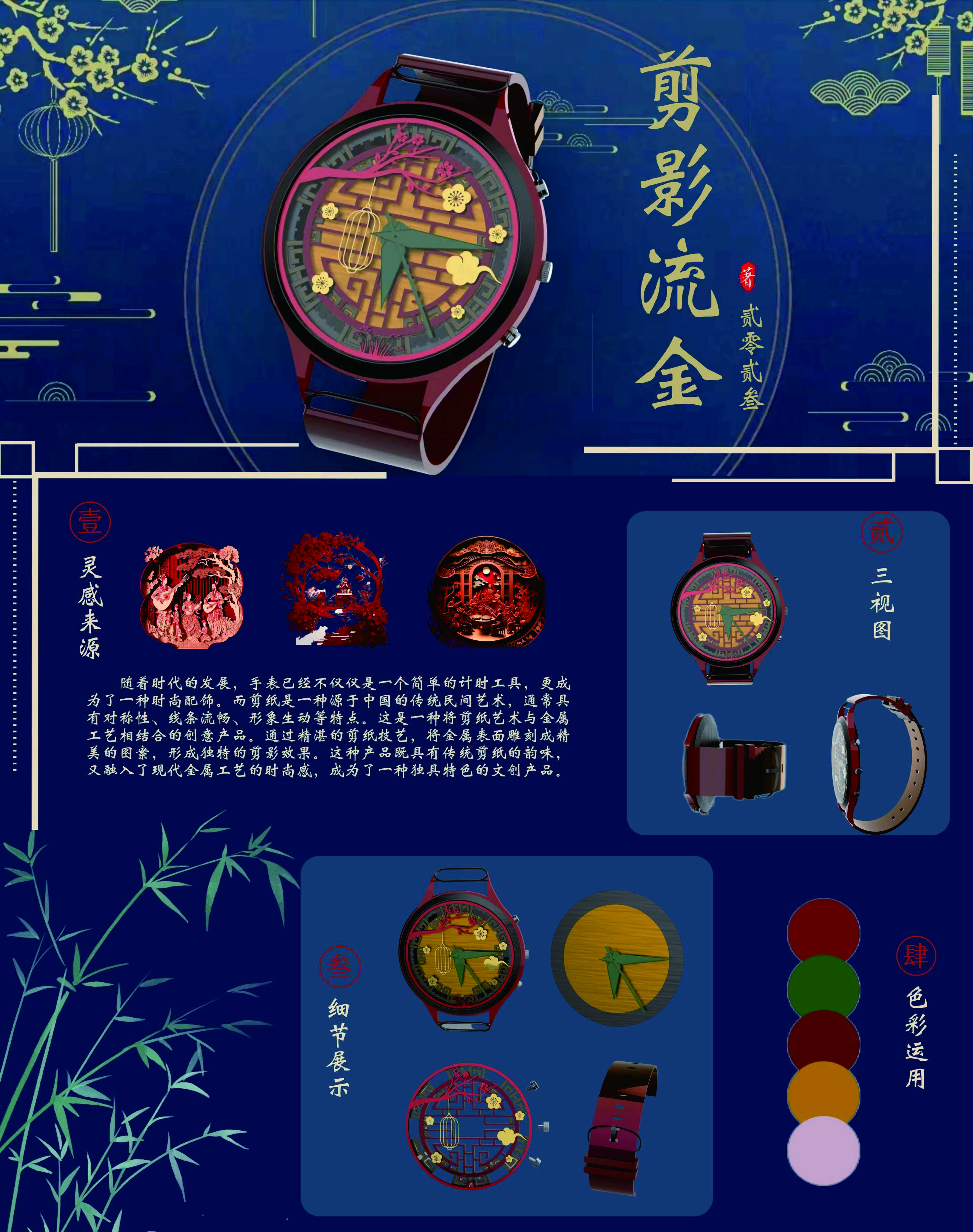 手表是一种佩戴在手腕上的计时工具,通常由表盘、指针和表带组成。随着时代的发展,手表已经不仅仅是一个简单的计时工具,更成为了一种时尚配饰。而剪纸是一种源于中国的传统民间艺术,通常具有对称性、线条流畅、形象生动等特点。两者结合形成一种新的文创产品,以剪纸传统艺术为内涵,以创意为核心,以市场为导向,既具有传统剪纸艺术的韵味,又融入了现代金属工艺的时尚感。