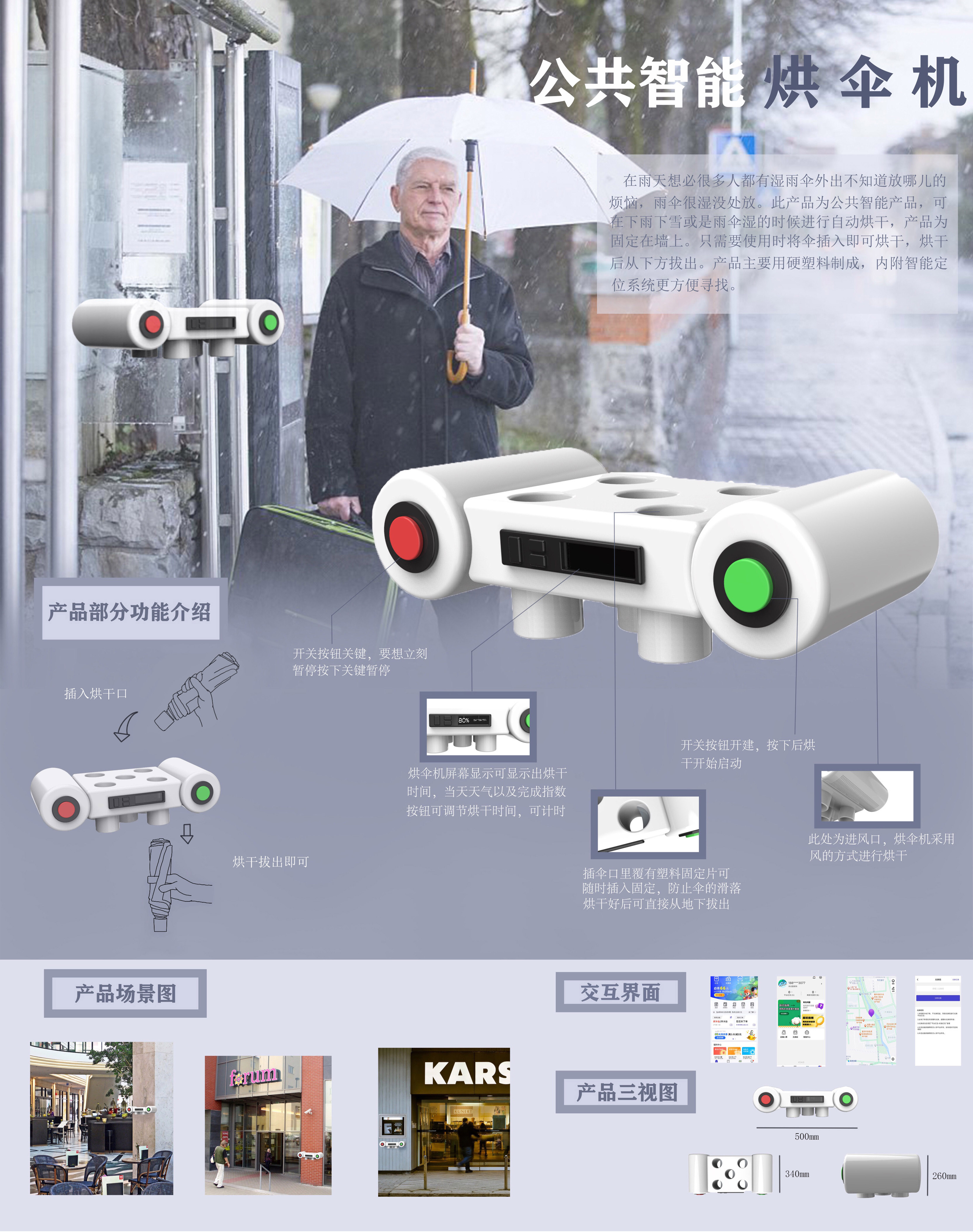 在雨天想必很多人都有湿雨伞外出不知道放哪儿的烦恼,雨伞很湿没处放。此产品为公共智能产品,可在下雨下雪或是雨伞湿的时候进行自动烘干,产品为固定在增上,只需要使用时将伞插入即可烘干,烘干后从下方拔出。产品主要用硬塑料制成,内附智能定位系统更方便寻找。
