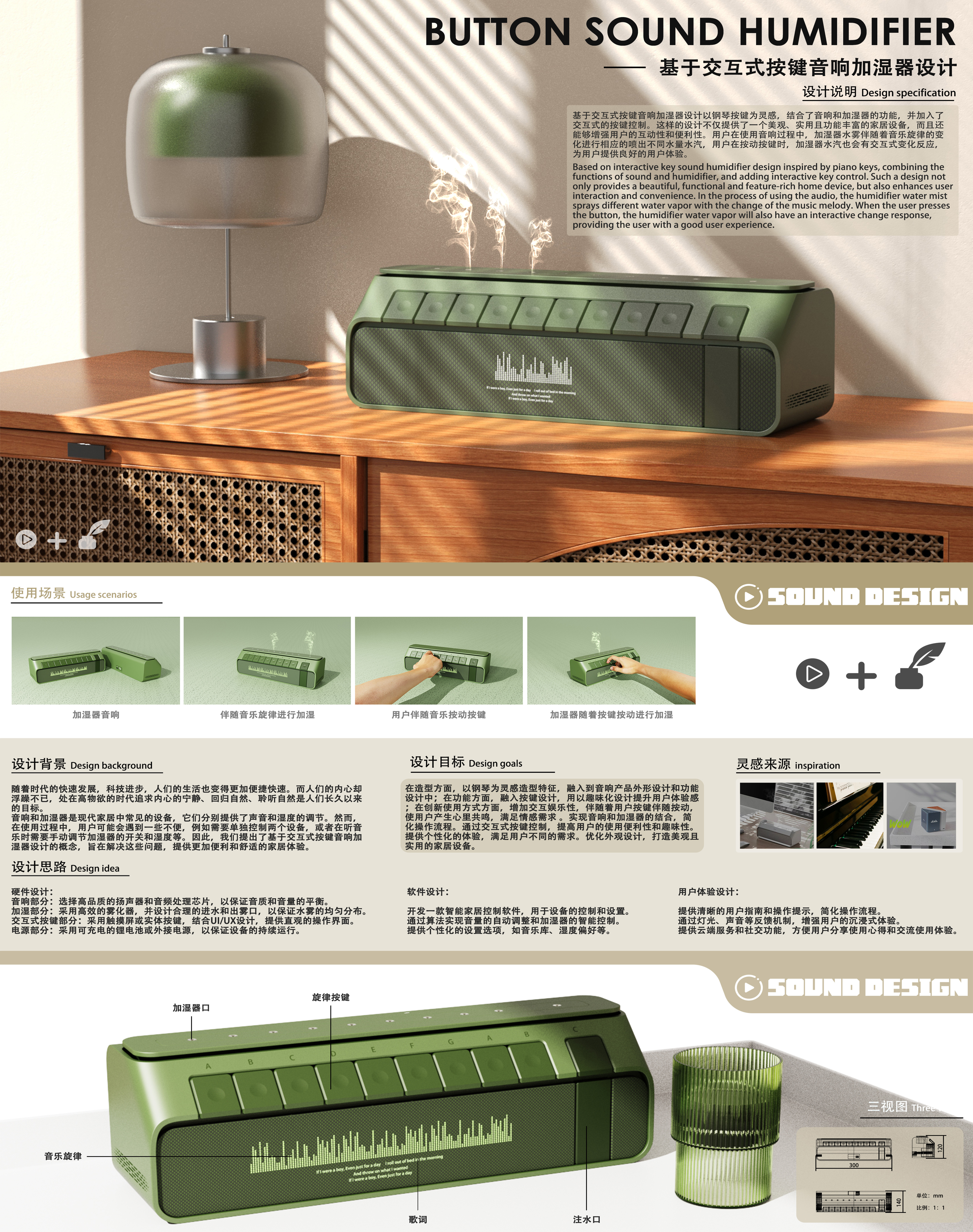 基于交互式按键音响加湿器设计以钢琴按键为灵感,结合了音响和加湿器的功能,并加入了交互式的按键控制。这样的设计不仅提供了一个美观、实用且功能丰富的家居设备,而且还能够增强用户的互动性和便利性。用户在使用音响过程中,加湿器水雾伴随着音乐旋律的变化进行相应的喷出不同水量水汽,用户在按动按键时,加湿器水汽也会有交互式变化反应,为用户提供良好的用户体验。