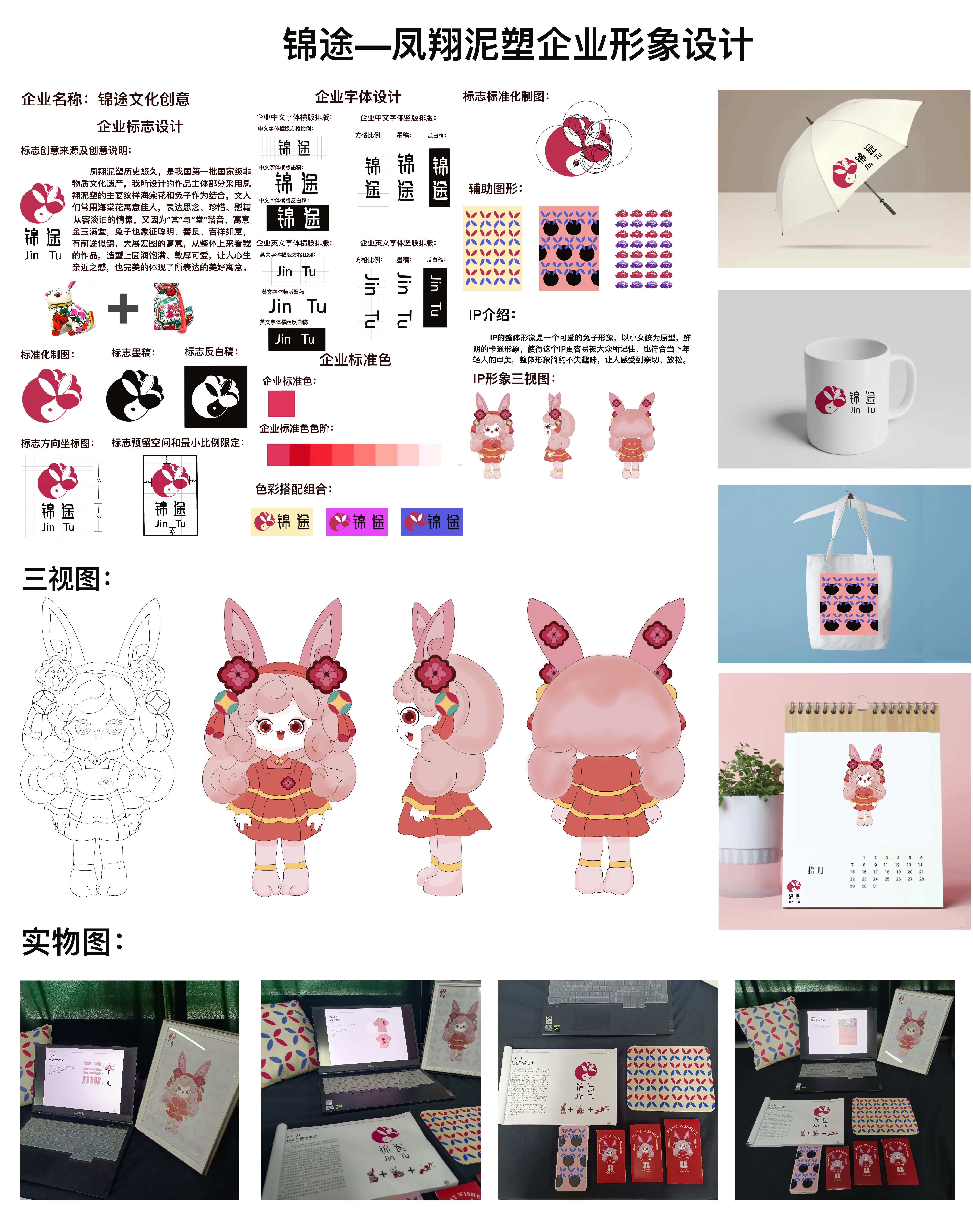 凤翔泥塑历史悠久,是我国第一批国家级非物质文化遗产,我所设计的作品主体部分采用凤翔泥塑的主要纹样海棠花和兔子作为结合,文人们常用海棠花寓意佳人,表达思念、珍惜、慰籍从容淡泊的情愫。又因为”棠”与”堂”谐音,寓意金玉满堂,兔子也象征聪明、善良、吉祥如意有前途似锦、大展宏图的寓意,从整体上来看我的作品,造型上圆润饱满、敦厚可爱,让人心生亲近之感,也完美的体现了所表达的美好寓意。